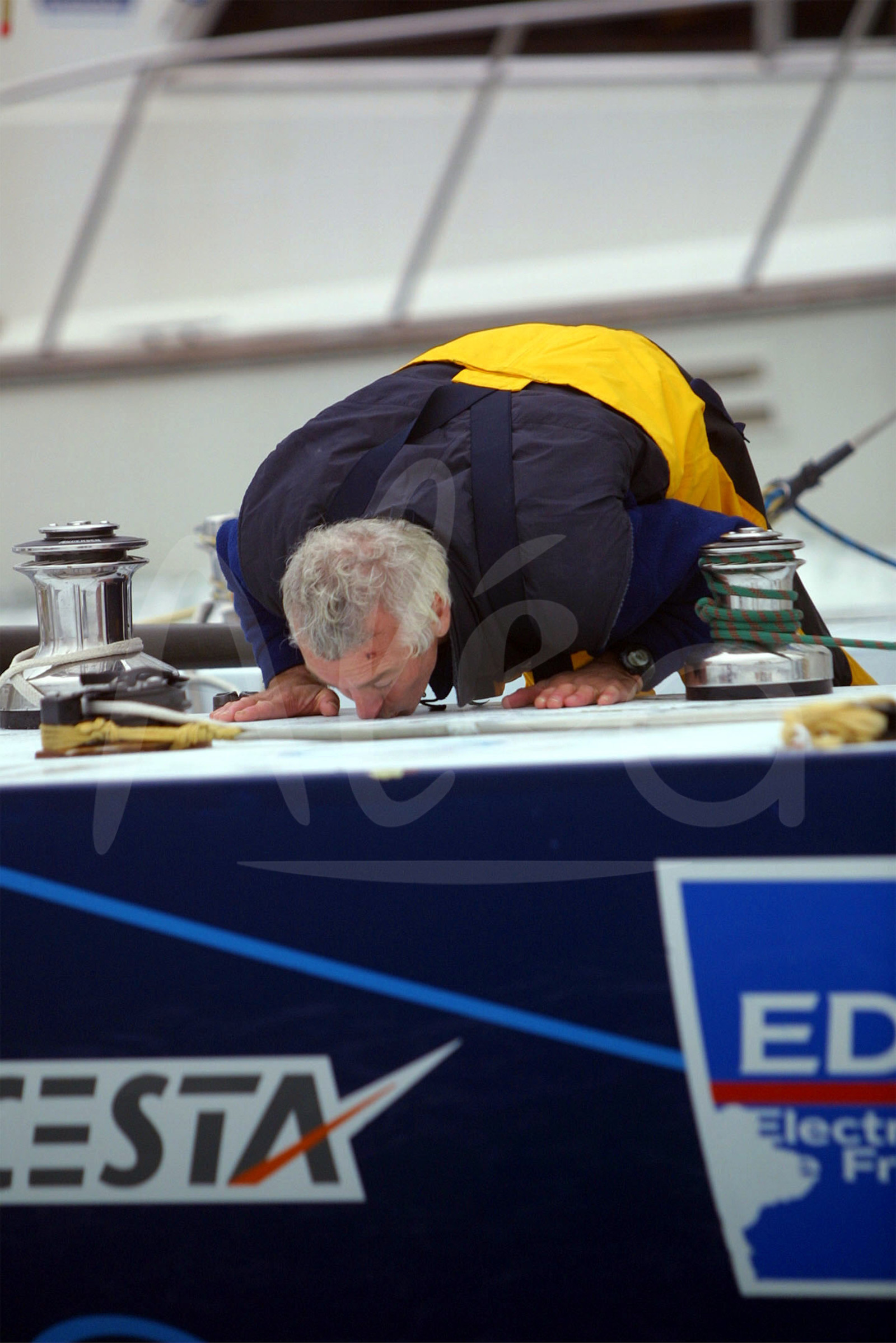 | Description | Yves Parlier, Aquitaine Innovations, finishing 13th of the solo round the world sailing race Vendee Globe, 4th edition, with his jury rig repaired in total autonomy, kissing his boat in Les Sables d'Olonne, on March 16th, 2001 - Photo Jacques Vapillon / ALEA .. |