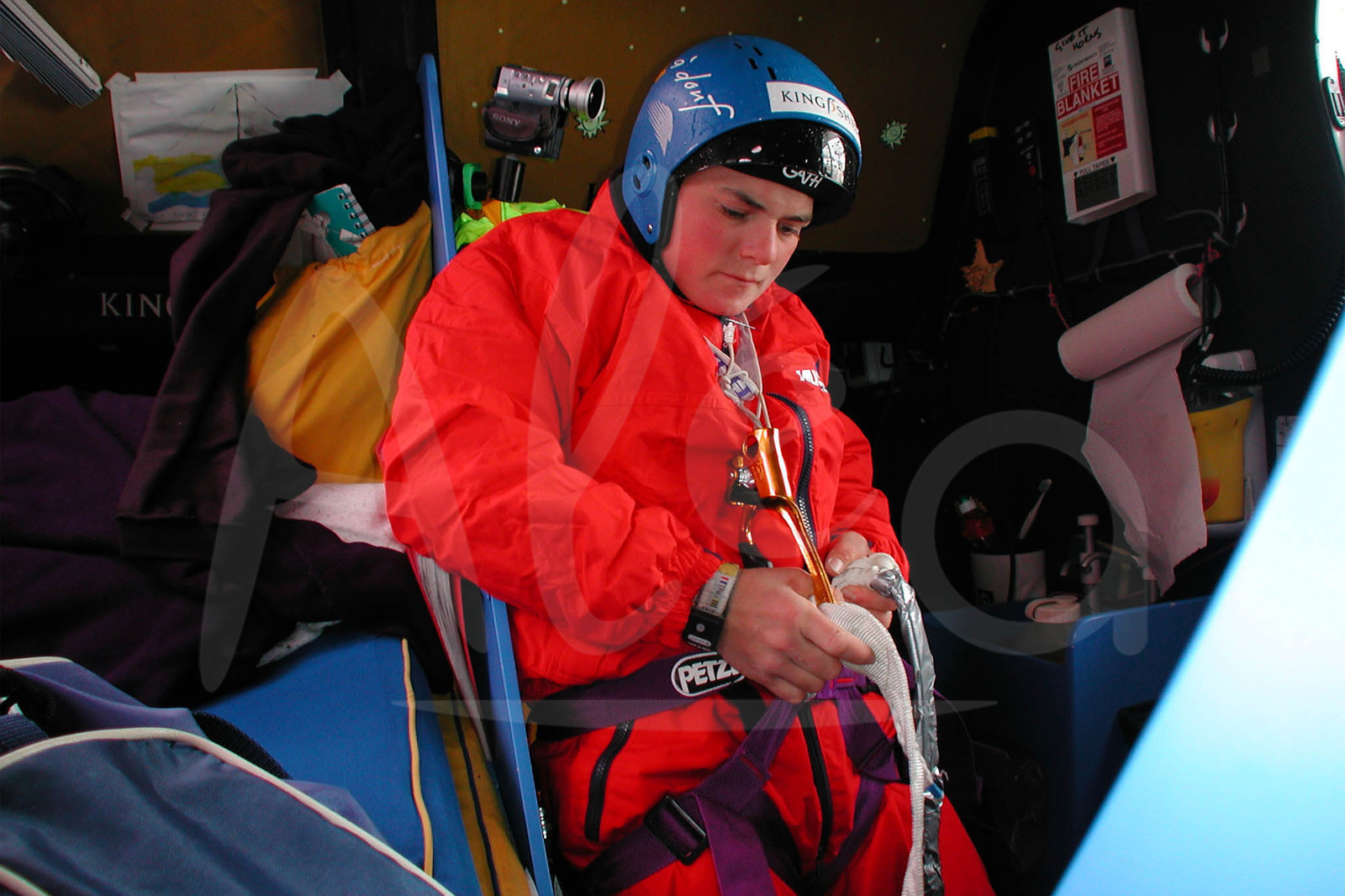 | Description | Ellen Macarthur, aboard Kingfisher, self portrait preparing herself for a climb in the 26 meters mast where she spent 4 hours fixing it in the South Indian Ocean during the solo round the world sailing race Vendee Globe, 4th edition, on December 24th, 2000 - Photo Ellen Macarthur / Alea.. |