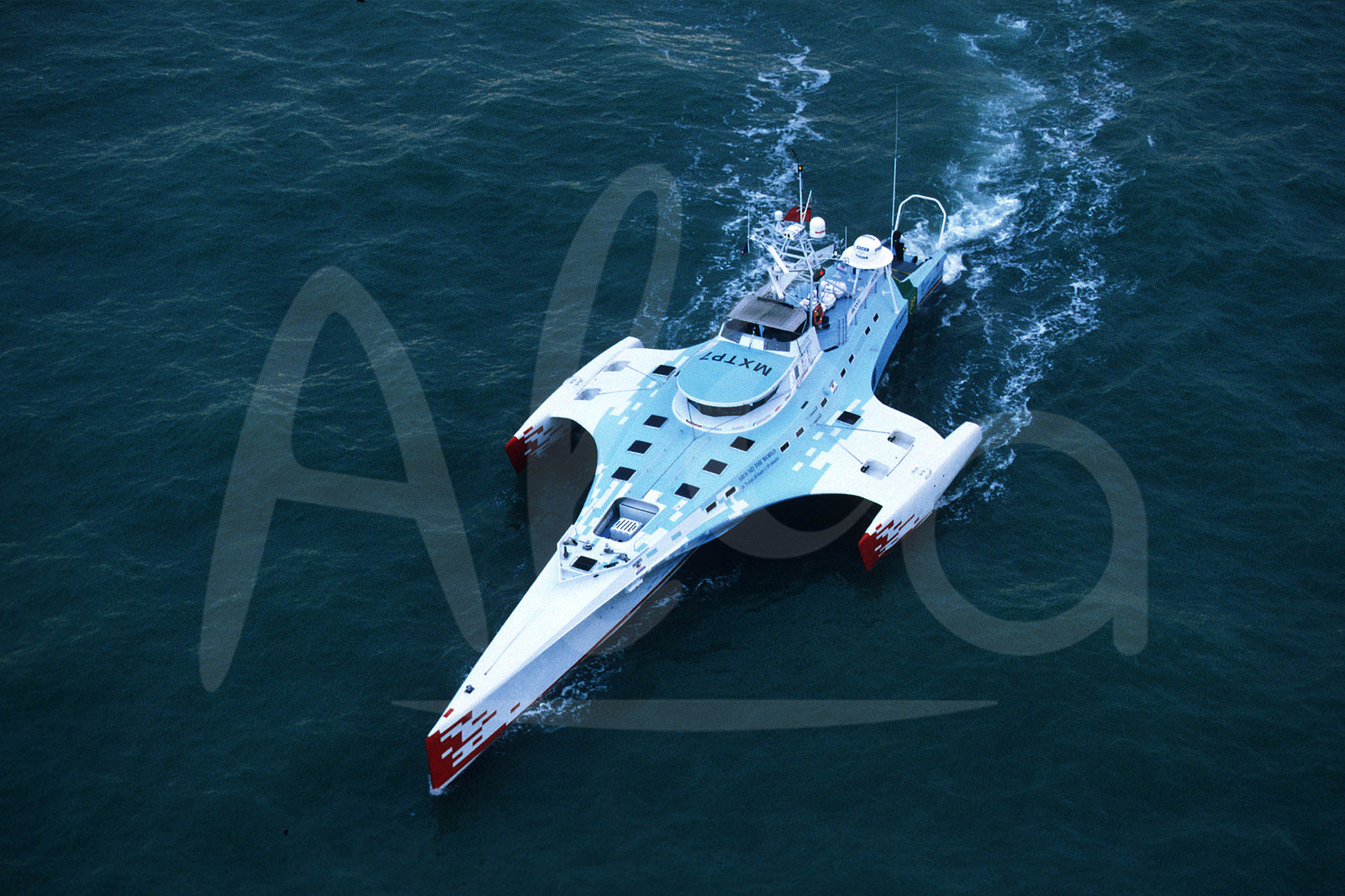 | Description | Motorboat trimaran Cable & Wireless Adventurer, meant to sail along the fleet during first days of the solo round the world sailing race Vendee Globe, 4th edition, in Les Sables d'Olonne, France, on November 9th, 2000 - Photo Benoit Stichelbaut / ALEA |
