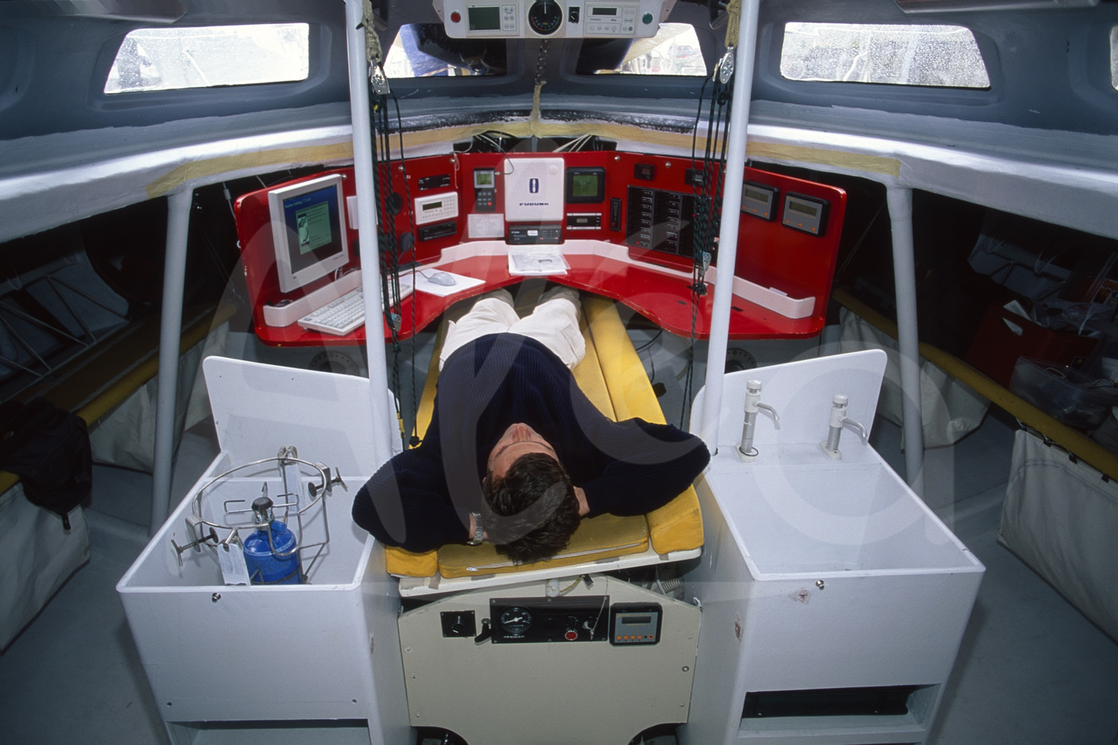 | Description | Illustration sleep for Marc THIERCELIN, Active Wear, before the round-the-world solo sailing yacht race Vendee Globe in Les Sables d'Olonne, West France, on October, 2000 - © Bernard Rubinstein / Alea |