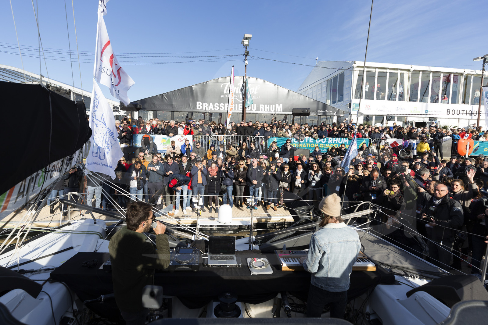 | Description | Christening by the DJ "Breakbot and Irfane", godfathers of IMOCA Newrest – Arts & Fenetres, skipper Fabrice Amedeo, during the pre-start of the Route du Rhum 2018, on November 3rd, 2018 in St-Malo, north Brittany, France - Photo Jean-Marie Liot / Newrest – Arts & Fenetres |