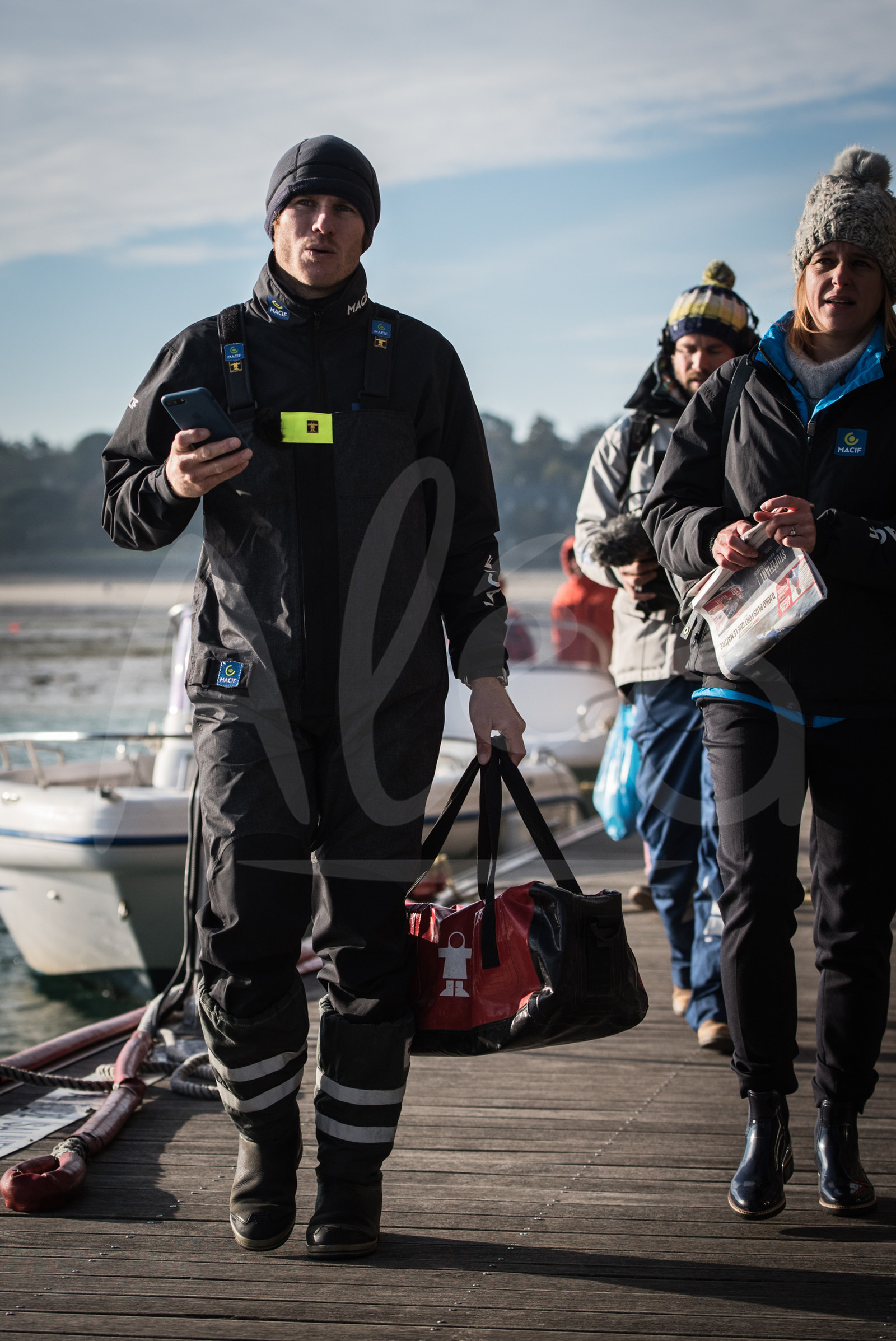 | Description | Francois Gabart, skipper ultime MACIF, on his way to his boat offshore with Stephanie Andre, PR, before start of the Route du Rhum 2018, on November 4th, 2018 in St-Malo, north Brittany, France - Photo Stephanie Billarant / Alea |