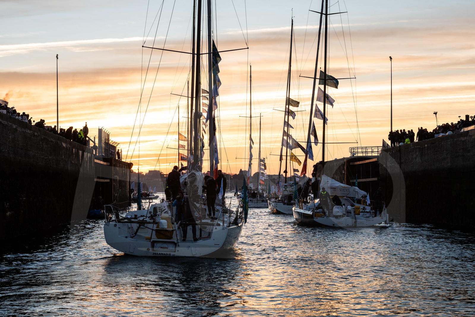 | Description | General view of the public while class 40 are leaving pontoons to pass a lock towards moorings, they will spend the night before the start of the Route du Rhum 2018, on November 3rd, 2018 in St-Malo, north Brittany, France - Photo Jean-Louis Carli / Alea |