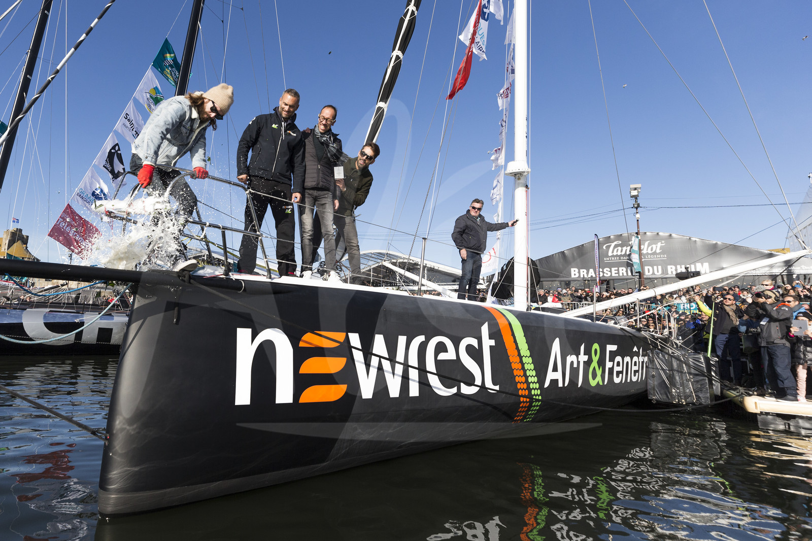 | Description | Christening by the DJ "Breakbot and Irfane", godfathers of IMOCA Newrest – Arts & Fenetres, skipper Fabrice Amedeo, together with Yohann Diniz, French race walker, during the pre-start of the Route du Rhum 2018, on November 3rd, 2018 in St-Malo, north Brittany, France - Photo Jean-Marie Liot / Newrest – Arts & Fenetres |