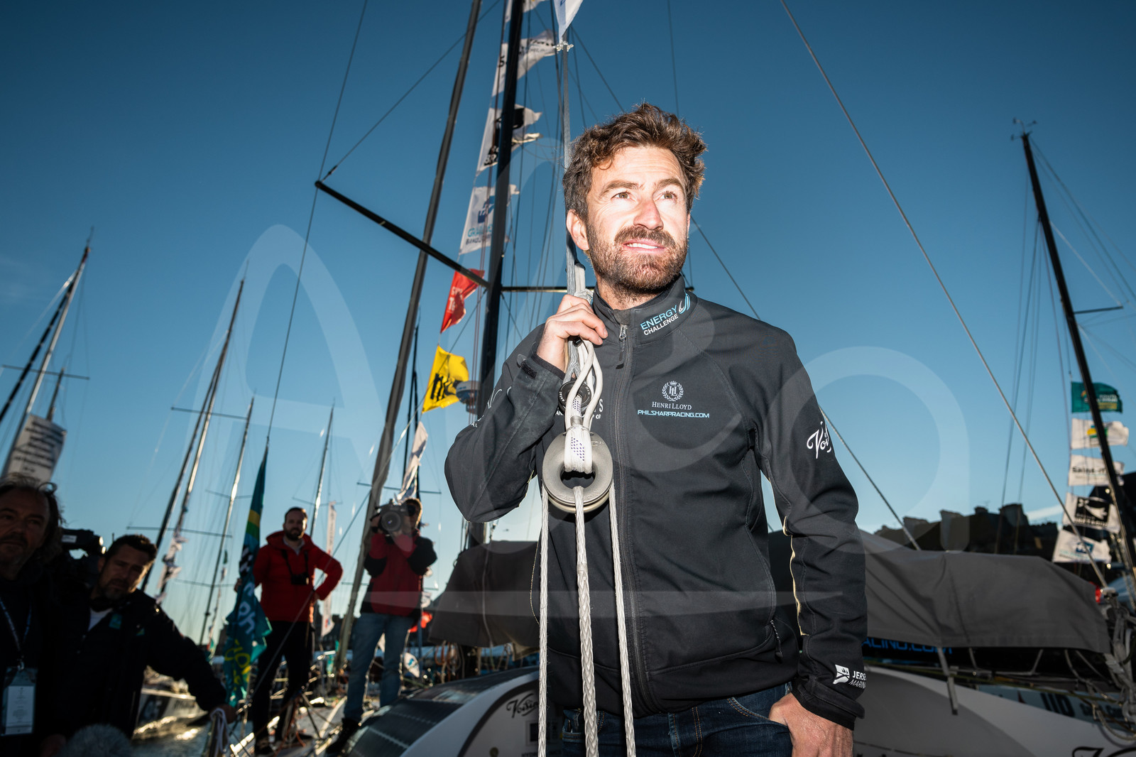 | Description | On board class 40 Imerys clean energy, skipper Phil Sharp, leaving pontoons to move towards his boat during start of the Route du Rhum 2018, on November 3rd, 2018 in St-Malo, north Brittany, France - Photo Jean-Louis Carli / Alea |