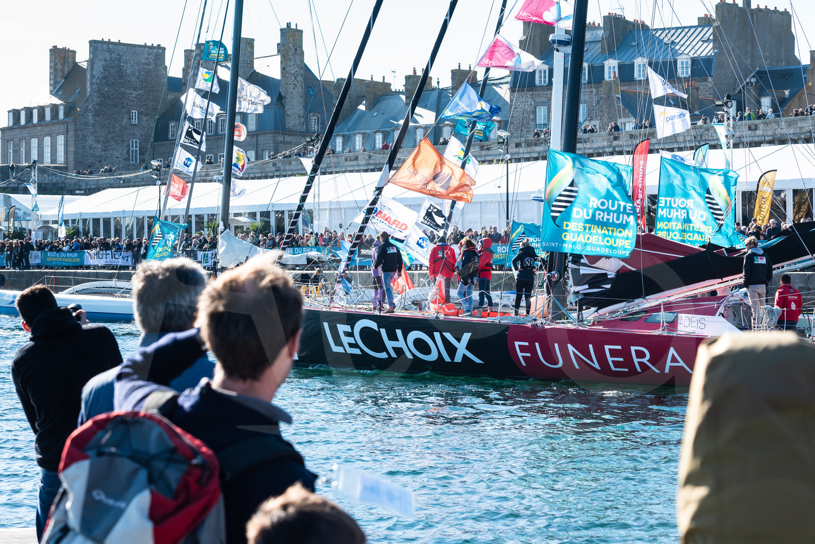 | Description | Ambiance of Rhum Mono Le Choix Funeraire, skipper Nils Boyer, leaving pontoon during the pre-start of the Route du Rhum 2018, on November 3rd, 2018 in St-Malo, north Brittany, France - Photo Jean-Louis Carli / Alea |