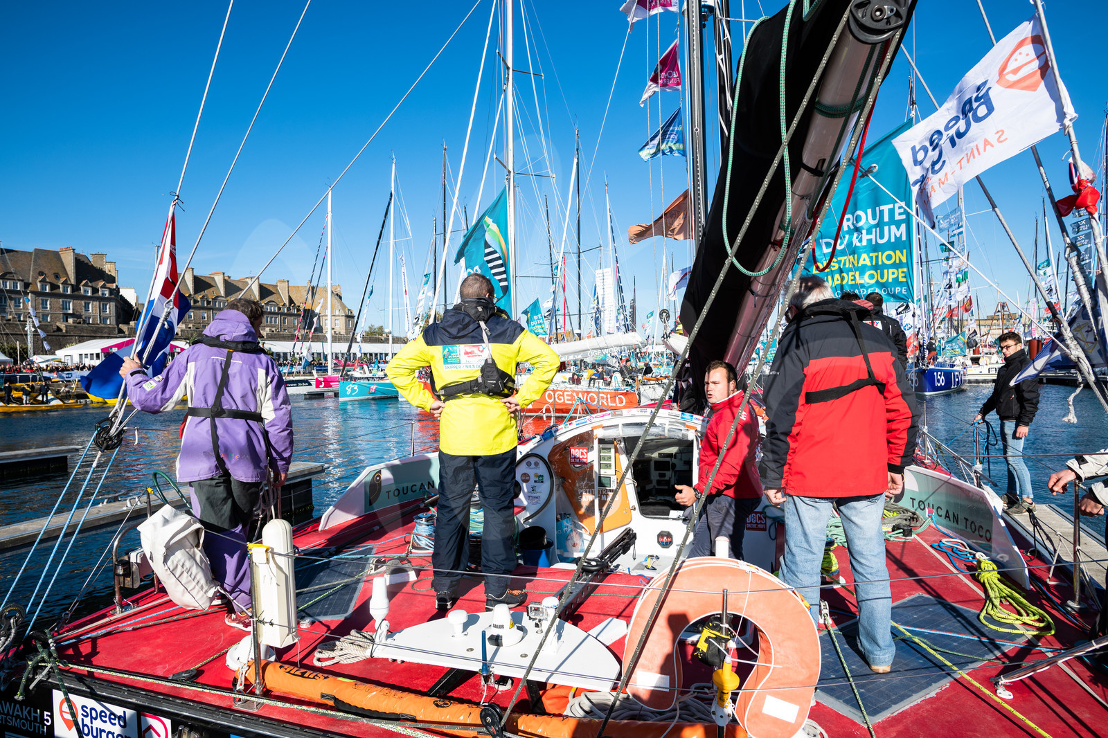 | Description | Ambiance of Rhum Mono Le Choix Funeraire, skipper Nils Boyer, leaving pontoon during the pre-start of the Route du Rhum 2018, on November 3rd, 2018 in St-Malo, north Brittany, France - Photo Jean-Louis Carli / Alea |