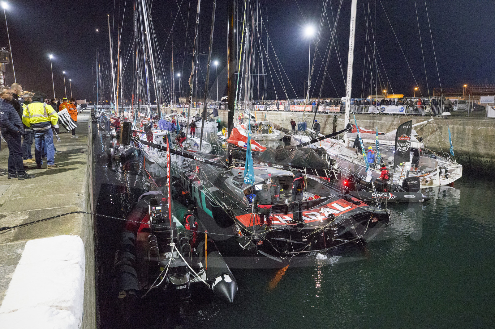 | Description | IMOCA Charal, skipper Jeremie Beyou, passing the lock in order to set outside for the night before start, during the pre-start of the Route du Rhum 2018, on November 4th, 2018 in St-Malo, north Brittany, France - Photo Jean-Marie Liot / Alea |