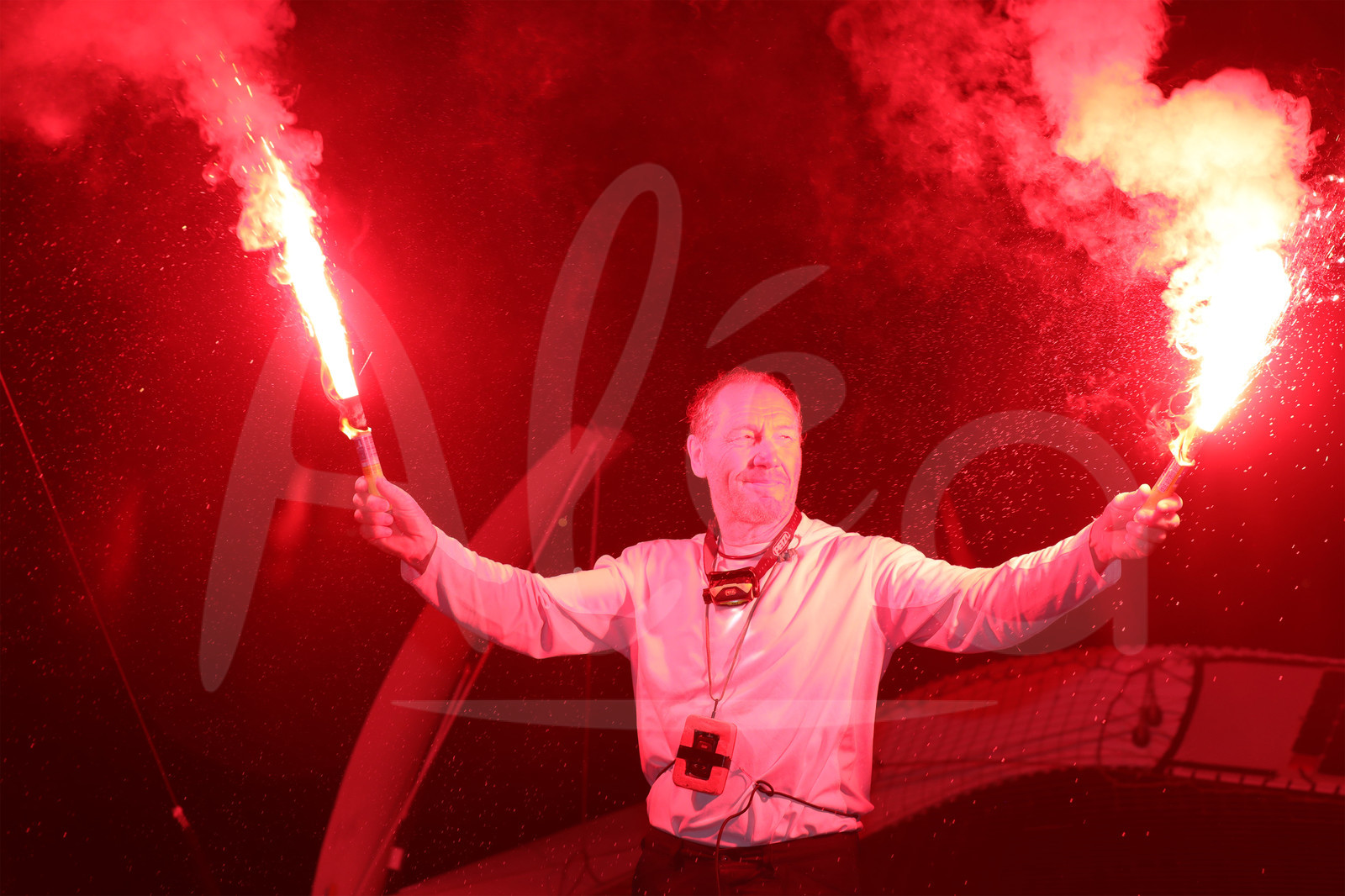 | Description | Celebration with flares for winner maxi trimaran IDEC Sport, skipper Francis Joyon, and new record in 7d 14h 21mn 47sec during arrival of the Route du Rhum 2018, on November 11th, 2018 in Pointe-a-Pitre, Guadeloupe, France - Photo Jean-Marie Liot / Alea |