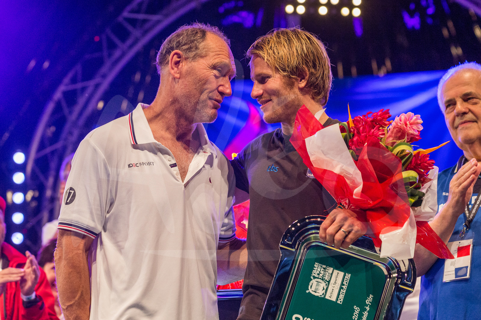 | Description | Celebration on podium for winner maxi trimaran IDEC Sport, skipper Francis Joyon, and new record in 7d 14h 21mn 47sec and 2nd place for MACIF, skipper Francois Gabart, during arrival of the Route du Rhum 2018, on November 11th, 2018 in Pointe-a-Pitre, Guadeloupe, France - Photo Jean-Marie Liot / Alea |