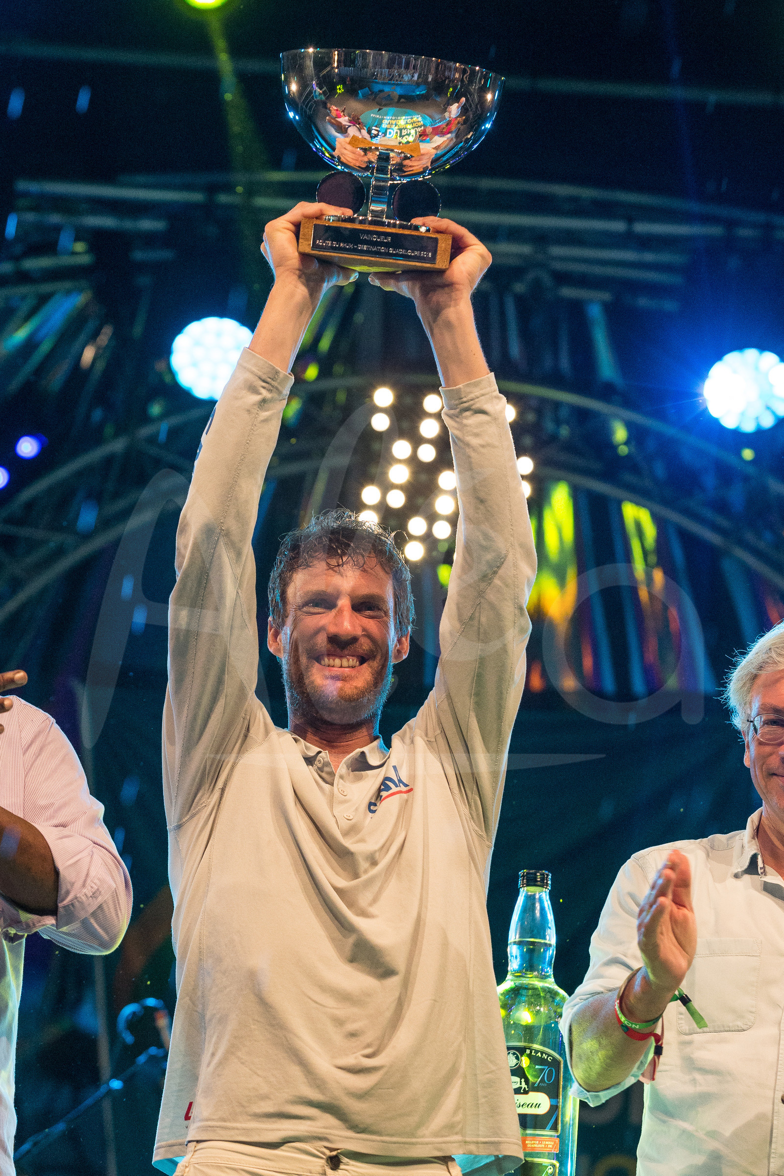 | Description | Celebration with trophy on podium for SMA, skipper Paul Meilhat, winner in Category imoca in 12d 11h 23mn 18sec, during arrival of the Route du Rhum 2018, on November 16th, 2018 in Pointe-a-Pitre, Guadeloupe, France - Photo Jean-Marie Liot / Alea |