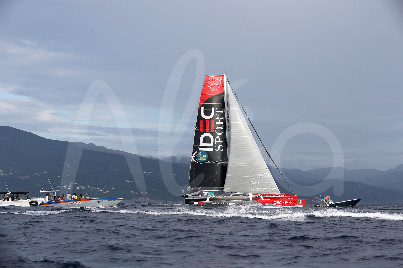 | Description | First images before finish for maxi trimaran IDEC Sport, skipper Francis Joyon, during arrival of the Route du Rhum 2018, on November 11th, 2018 in Pointe-a-Pitre, Guadeloupe, France - Photo Jean-Marie Liot / Alea |