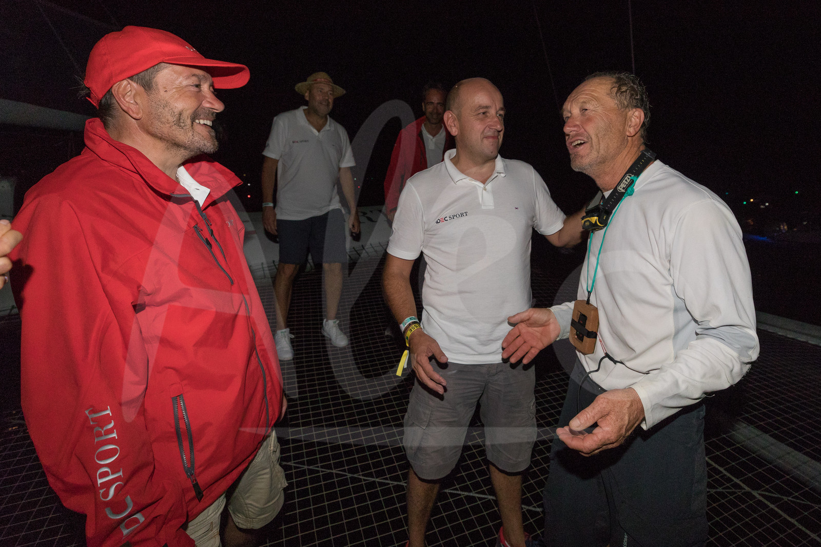 | Description | Celebration for the winner maxi trimaran IDEC Sport, skipper Francis Joyon, with Patrice Lafargue (Groupe IDEC Pdt) and Fabrice Thomazeau (Communication Mer & Media) and new record in 7d 14h 21mn 47sec during arrival of the Route du Rhum 2018, on November 11th, 2018 in Pointe-a-Pitre, Guadeloupe, France - Photo Jean-Marie Liot / Alea |