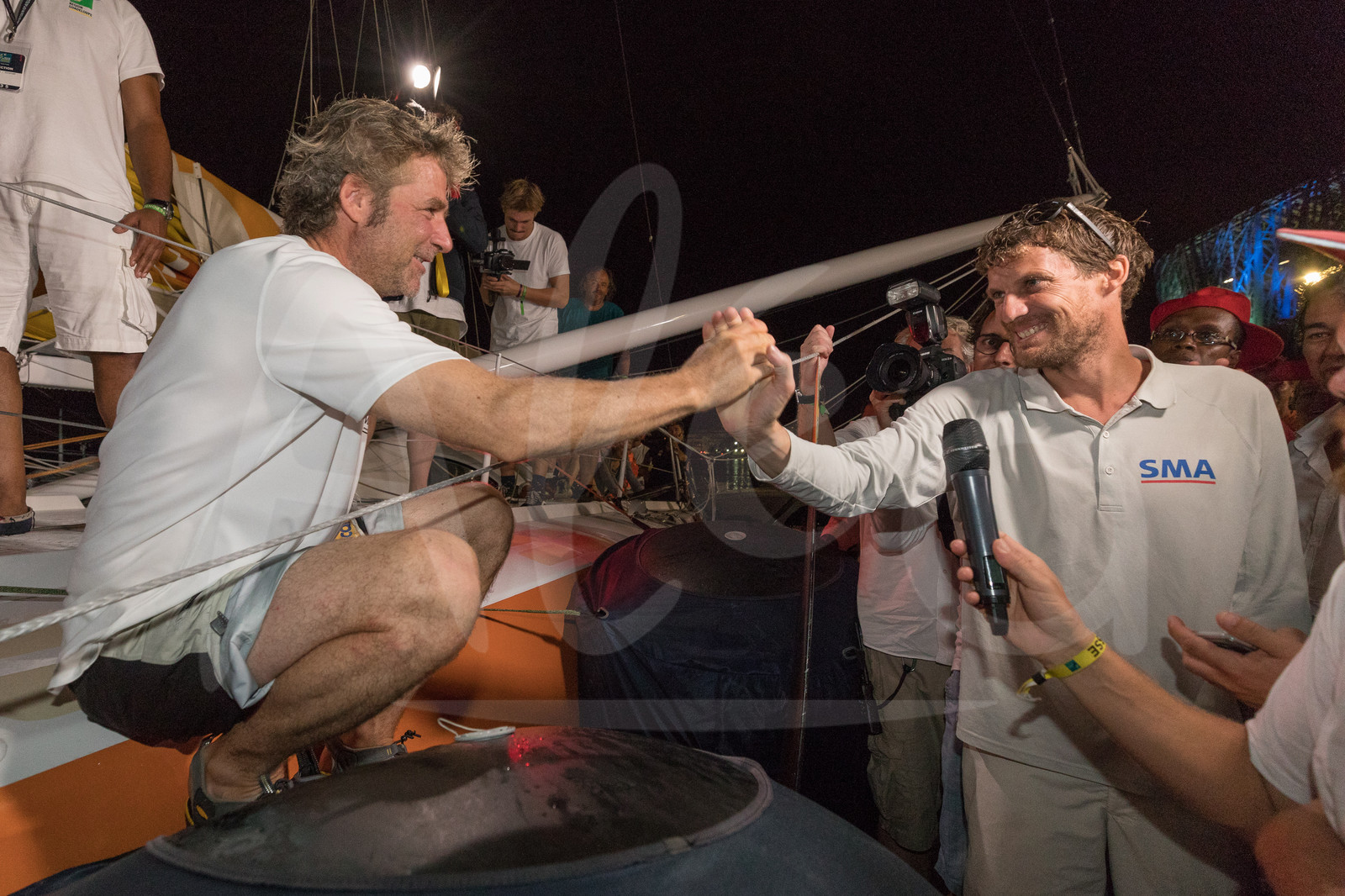 | Description | SMA, skipper Paul Meilhat, winner in Category imoca in 12d 11h 23mn 18sec, congratulates Yann Elies, skipper Ucar-St Michel, 2nd place, during arrival of the Route du Rhum 2018, on November 16th, 2018 in Pointe-a-Pitre, Guadeloupe, France - Photo Jean-Marie Liot / Alea |