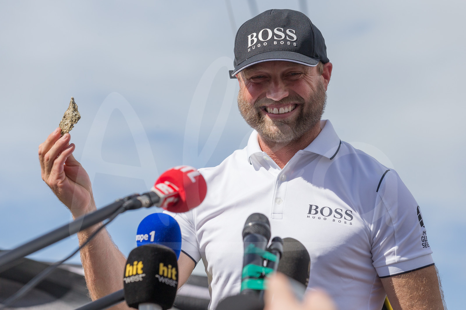 | Description | Media with Hugo Boss, skipper Alex Thomson showing a little rock, 1st arrived but had a 24 hours penalty for having used his engine after he grounded on rocks in North Guadeloupe, took 3rd place after penalty, during arrival of the Route du Rhum 2018, on November 16th, 2018 in Pointe-a-Pitre, Guadeloupe, France - Photo Jean-Marie Liot / Alea |