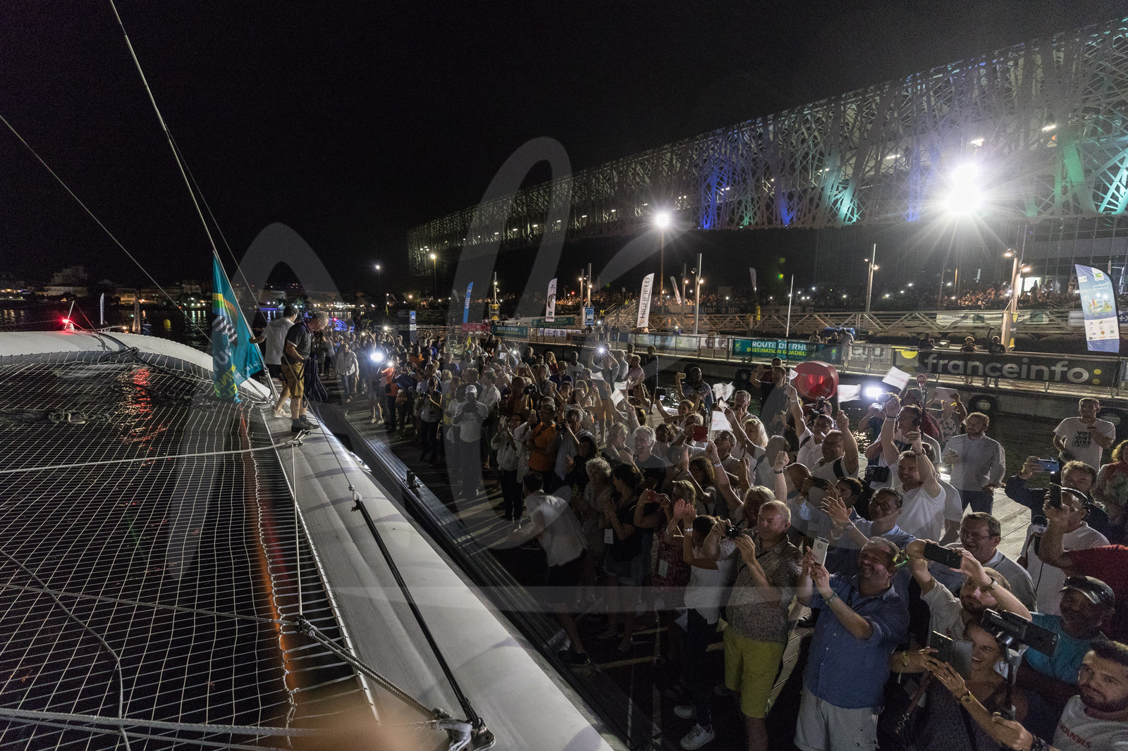| Description | Celebration with media and public for winner maxi trimaran IDEC Sport, skipper Francis Joyon, and new record in 7d 14h 21mn 47sec during arrival of the Route du Rhum 2018, on November 11th, 2018 in Pointe-a-Pitre, Guadeloupe, France - Photo Jean-Marie Liot / Alea |