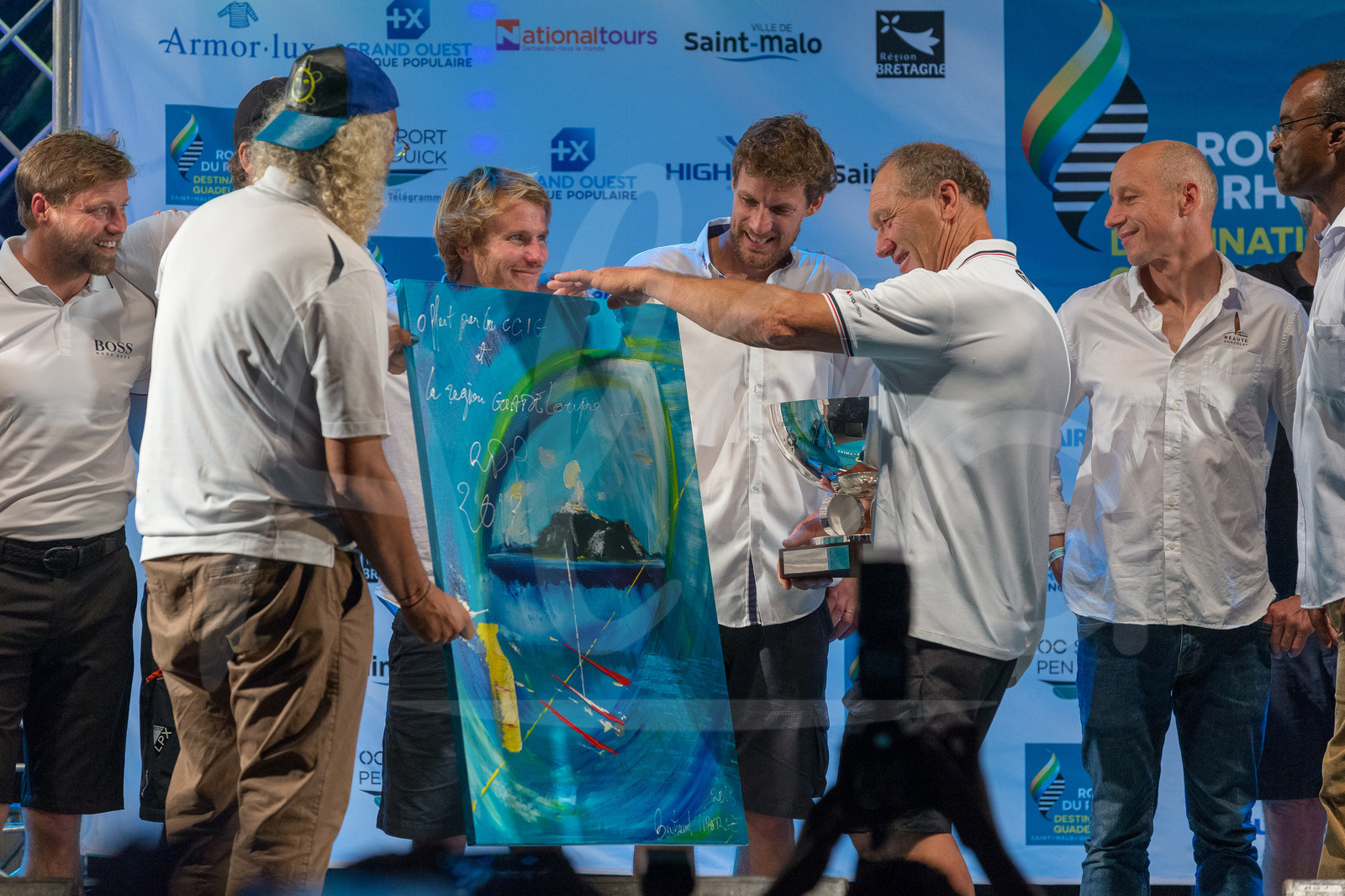 | Description | Prize ceremony and podium for winners in category IMOCA, Ultime and Multi50, from left to right, Paul Meilhat, skipper SMA, Francis Joyon, skipper IDEC Sport, receiving a gift, and Armel Tripon, skipper Reaute Chocolat, after arrival of the Route du Rhum 2018, on November 17th, 2018 in Pointe-a-Pitre, Guadeloupe, France - Photo Jean-Marie Liot / Alea |