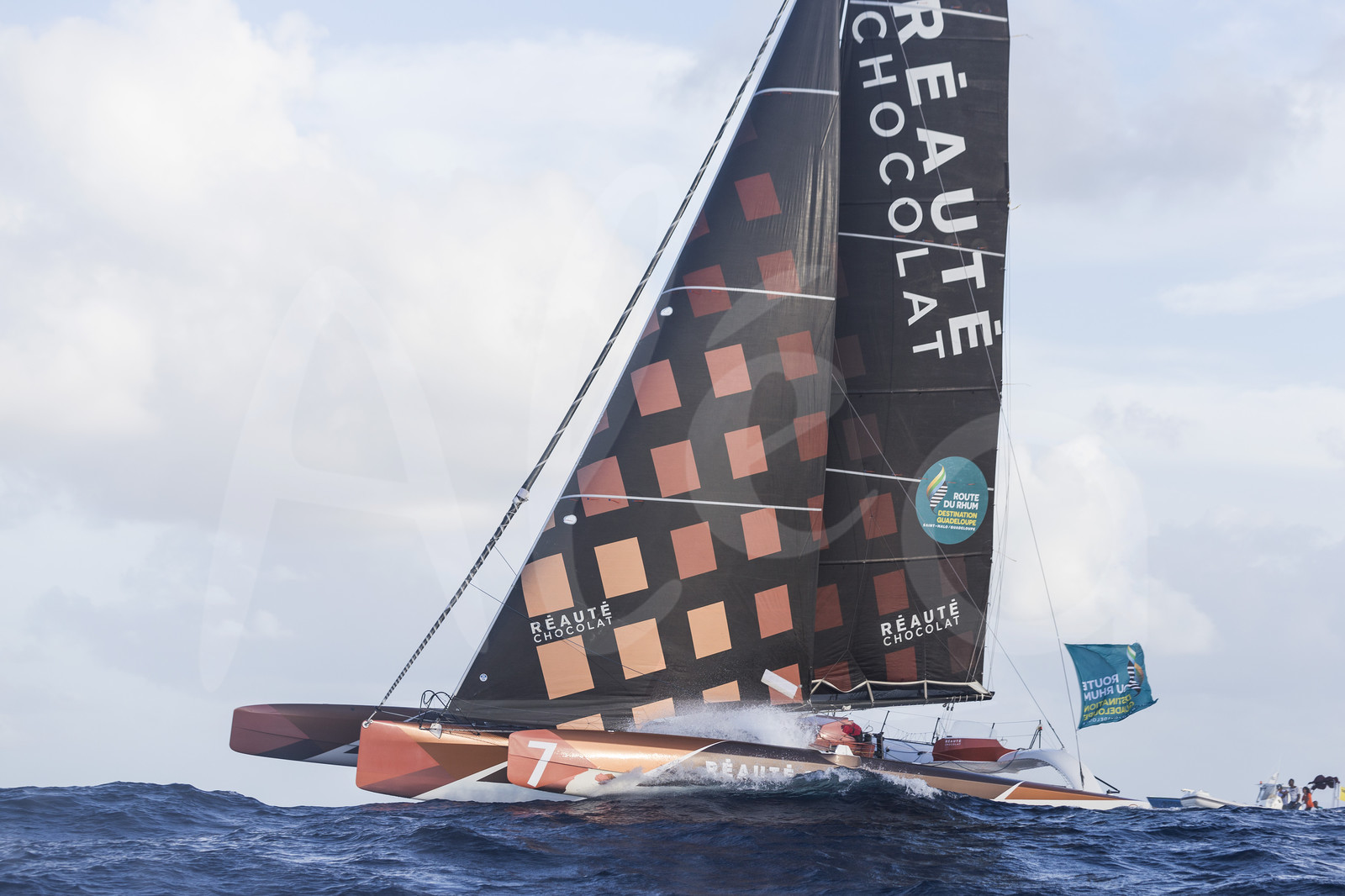| Description | Category multi 50, finish line for winner Reaute Chocolat, skipper Armel Tripon, third overall, during arrival of the Route du Rhum 2018, on November 15th, 2018 in Pointe-a-Pitre, Guadeloupe, France - Photo Jean-Marie Liot / Alea. |