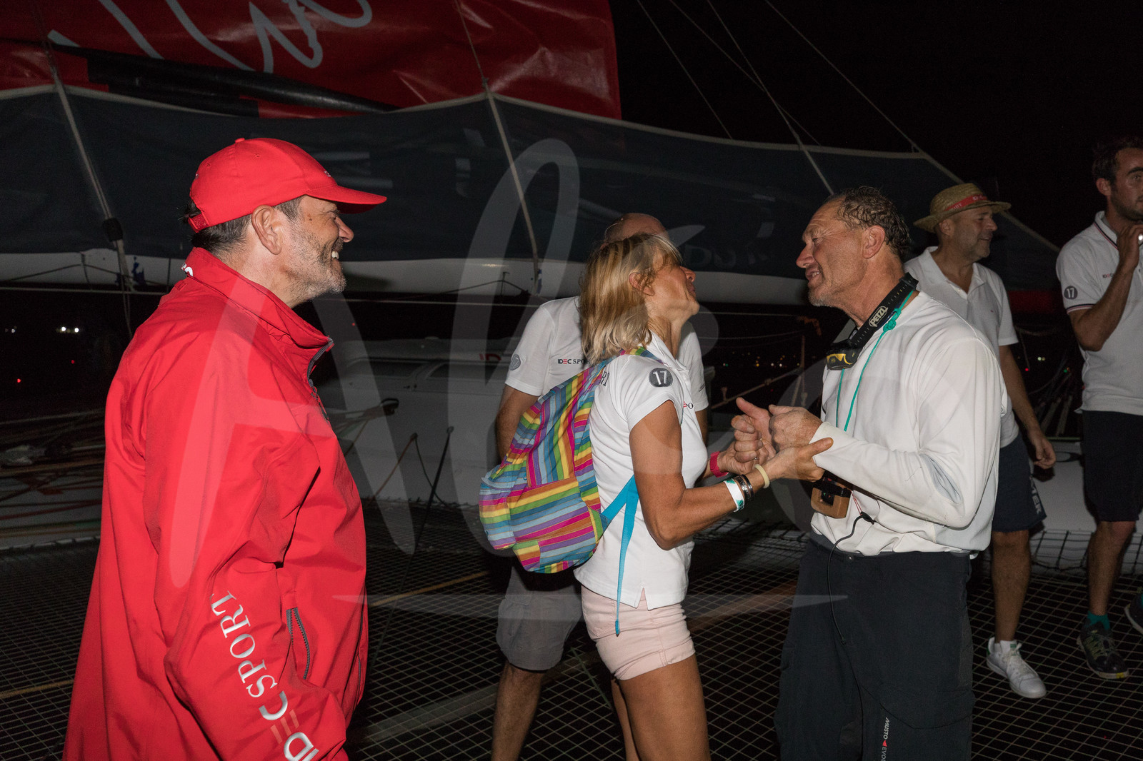 | Description | Celebration for the winner maxi trimaran IDEC Sport, skipper Francis Joyon, his wife Virginie and Patrice Lafargue (Groupe IDEC Pdt), and new record in 7d 14h 21mn 47sec during arrival of the Route du Rhum 2018, on November 11th, 2018 in Pointe-a-Pitre, Guadeloupe, France - Photo Jean-Marie Liot / Alea |
