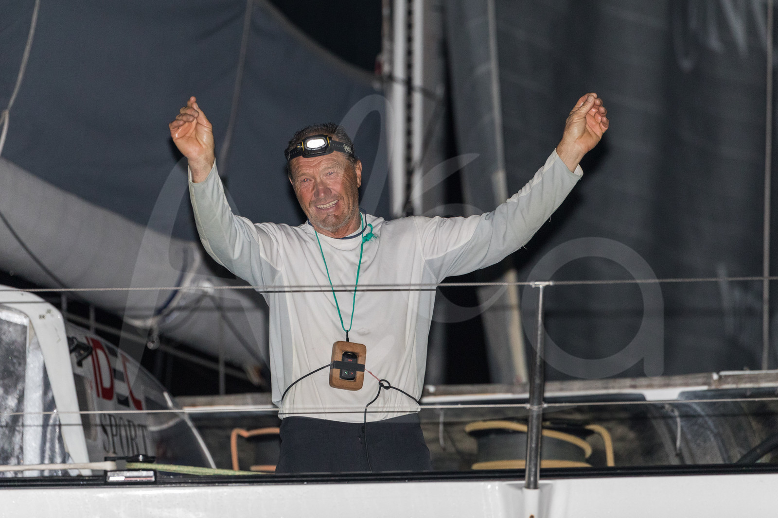 | Description | Celebration for winner maxi trimaran IDEC Sport, skipper Francis Joyon, and new record in 7d 14h 21mn 47sec during arrival of the Route du Rhum 2018, on November 11th, 2018 in Pointe-a-Pitre, Guadeloupe, France - Photo Jean-Marie Liot / Alea |
