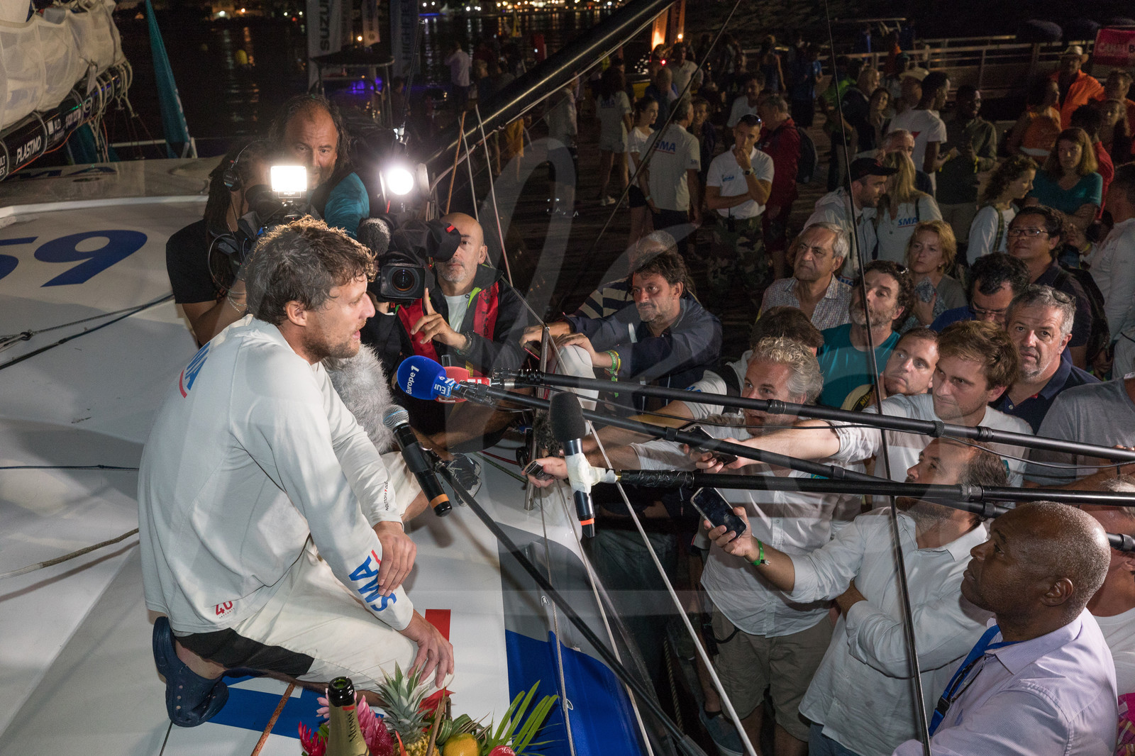 | Description | Celebration with media for SMA, skipper Paul Meilhat, winner in Category imoca in 12d 11h 23mn 18sec, during arrival of the Route du Rhum 2018, on November 16th, 2018 in Pointe-a-Pitre, Guadeloupe, France - Photo Jean-Marie Liot / Alea |