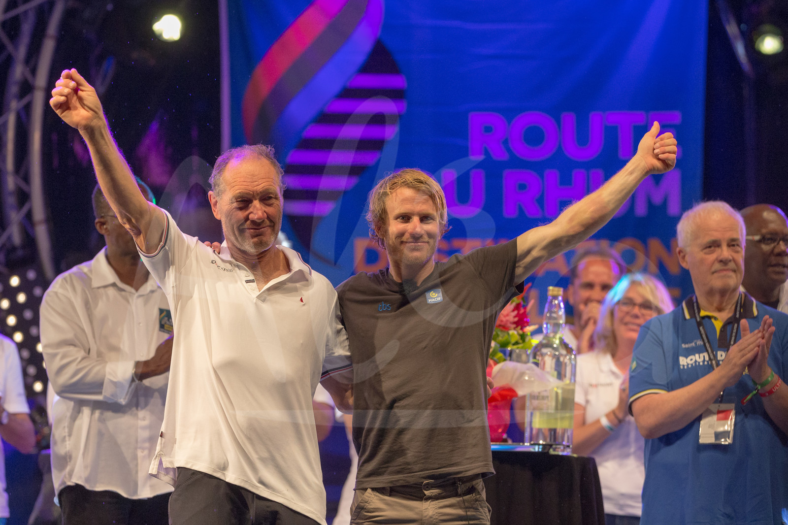 | Description | Celebration on podium for winner maxi trimaran IDEC Sport, skipper Francis Joyon, and new record in 7d 14h 21mn 47sec and 2nd place for MACIF, skipper Francois Gabart, during arrival of the Route du Rhum 2018, on November 11th, 2018 in Pointe-a-Pitre, Guadeloupe, France - Photo Jean-Marie Liot / Alea |