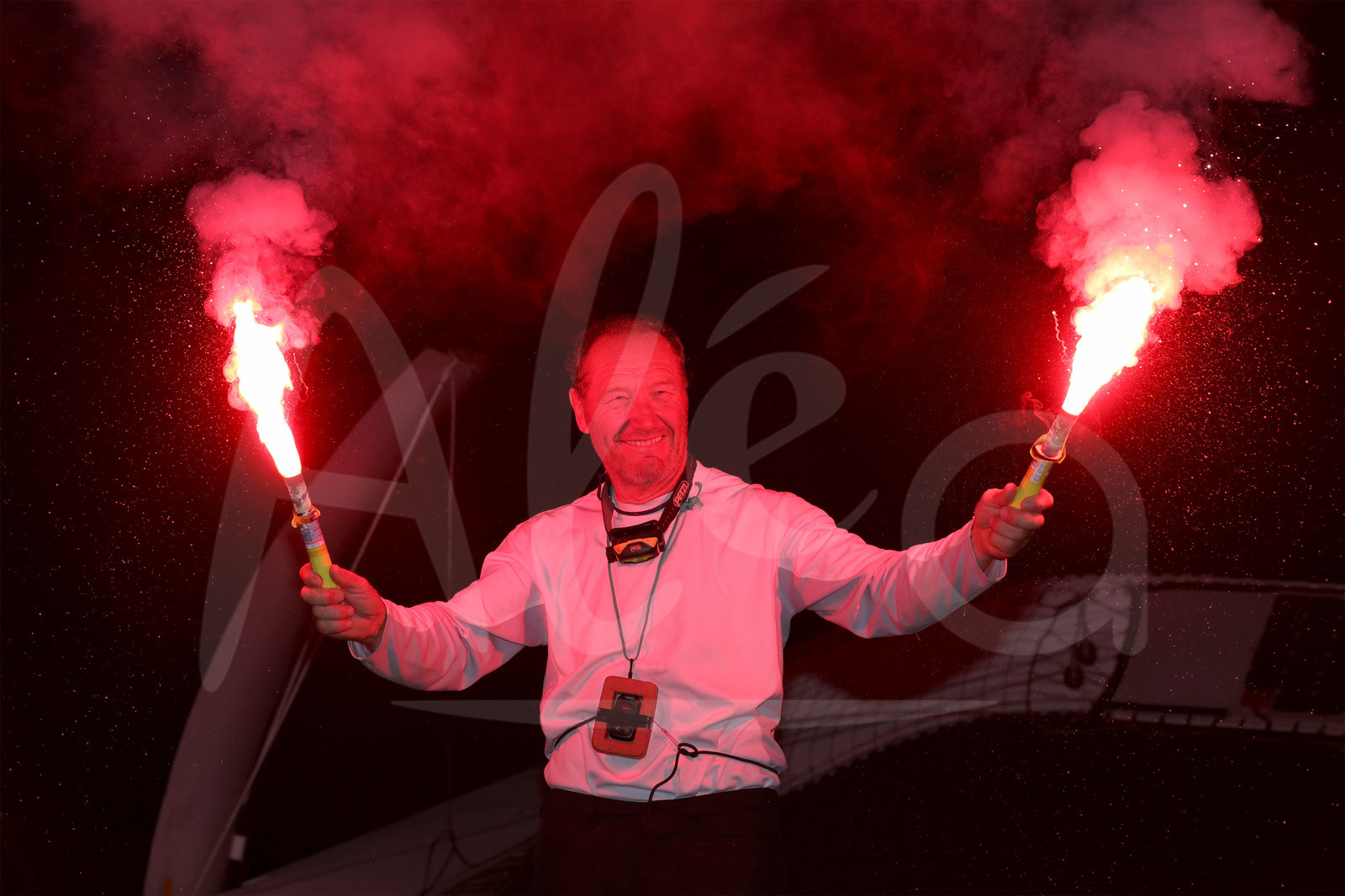| Description | Celebration with flares for winner maxi trimaran IDEC Sport, skipper Francis Joyon, and new record in 7d 14h 21mn 47sec during arrival of the Route du Rhum 2018, on November 11th, 2018 in Pointe-a-Pitre, Guadeloupe, France - Photo Jean-Marie Liot / Alea |