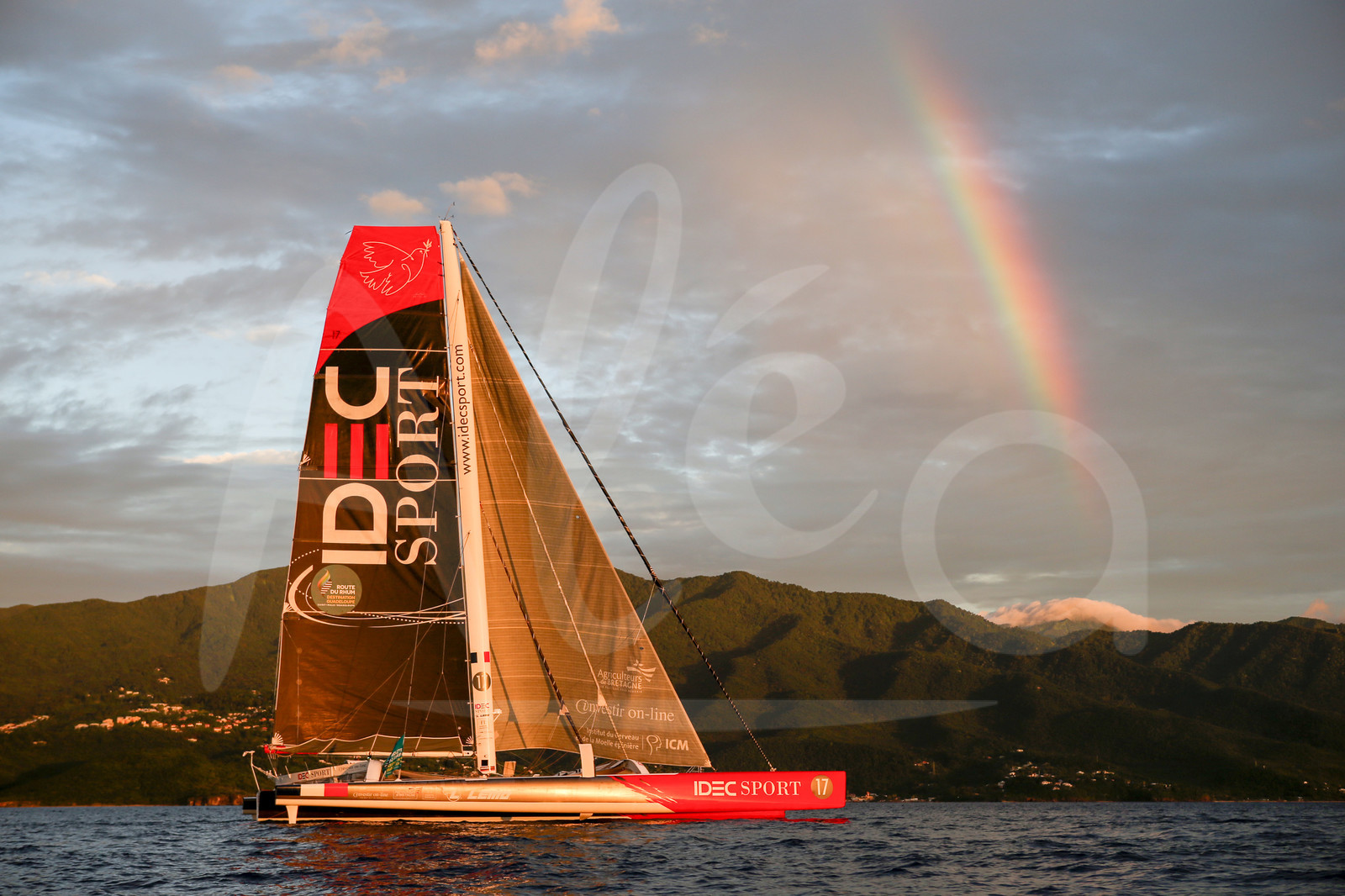 | Description | First images before finish for maxi trimaran IDEC Sport, skipper Francis Joyon, under a rainbow during arrival of the Route du Rhum 2018, on November 11th, 2018 in Pointe-a-Pitre, Guadeloupe, France - Photo Jean-Marie Liot / Alea |