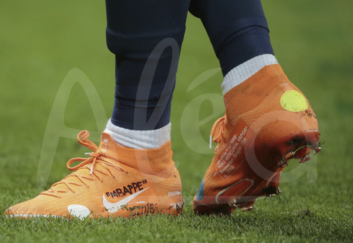 | Description | Illustration des chaussures de foot orange Nike du joueur Mbappe - Photo Stéphane Allaman / Alea |