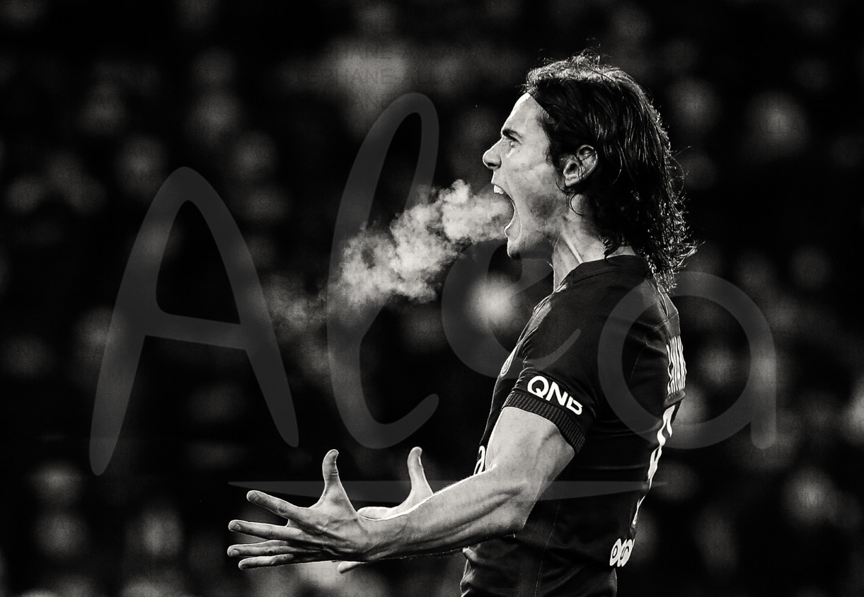 | Description | Illustration noir et blanc du joueur de foot du PSG, Edinson Cavani (El Matador) célébrant un but, exhalant de la vapeur d’eau (fumée) par la bouche - Photo Stéphane Allaman / Alea |