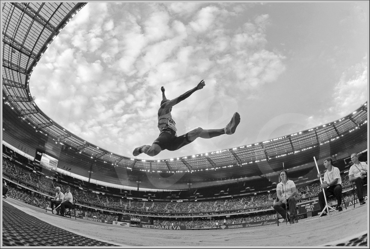 | Description | Illustration noir et blanc de saut en longueur au Stade de France - Photo Stéphane Allaman / Alea |