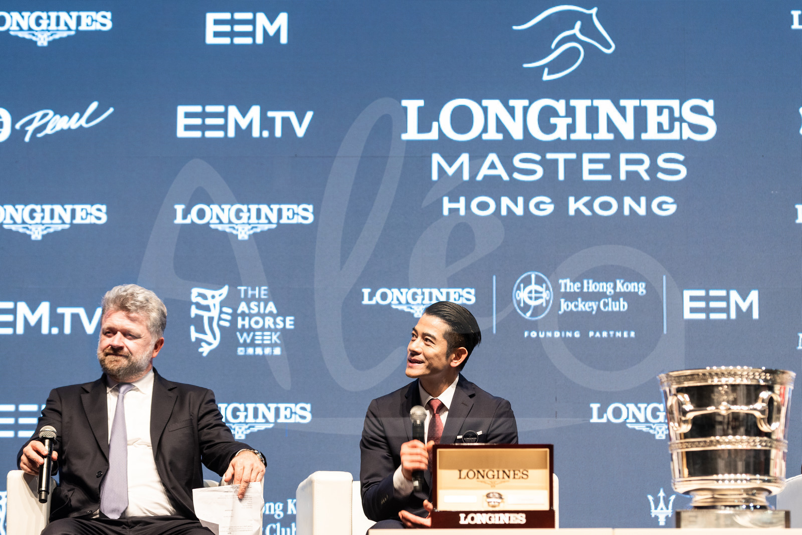 | Description | Christophe Ameeuw (PDG EEM), Aaron KWOK, Longines ambassador of Elegance, with the winners LYNCH, Denis / IRL, DELESTRE, Simon / FRA, SCHWIZER, Pius / SUI, Trophy and VHP watch during press conference of the Longines Masters Hong Kong 2019, at Asia World Expo on February 17th, 2019 - Photo Jean-Louis Carli / Alea / EEM |