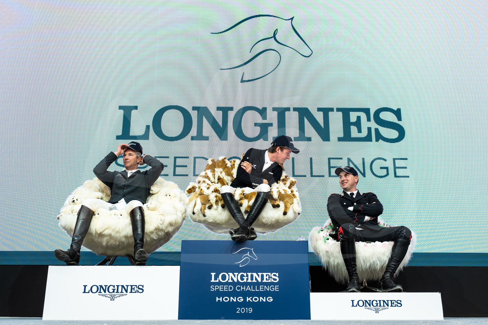 | Description | from left to right, DELAVEAU, Patrice / FRA, ALLEN, Bertram / IRL, GAUDIANO, Emanuele / ITA on the provisional podium during The Longines Speed Challenge, at the Longines Masters Hong Kong 2019, Asia World Expo, on February 16th, 2019 - Photo Jean-Louis Carli / Alea / EEM |