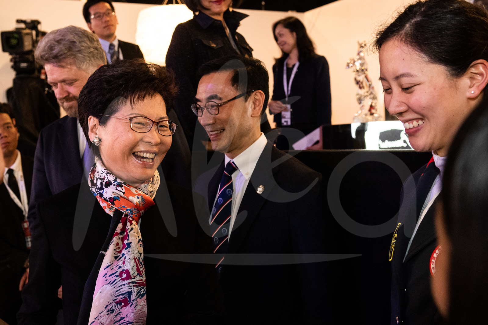 | Description | Carrie LAM, Chief Executive HKSAR, in the EEM Society VIP area Baccarat suite, with Christophe Ameeuw (PDG EEM), Scarlett LEUNG (HKJC) and Michael LEE, Pdt HK Equestrian Federation, meeting the Hong Kong riders during the Longines Masters Hong Kong 2019, at Asia World Expo on February 17th, 2019 - Photo Jean-Louis Carli / Alea / EEM |