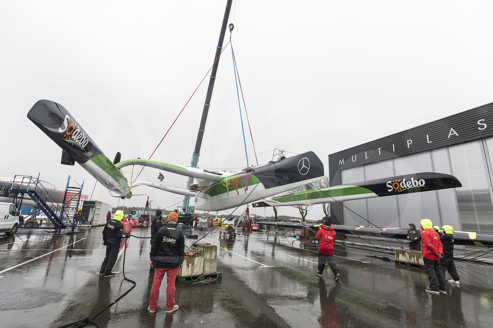 | Description | Launching new Sodebo Ultim 3, skipper Thomas Coville, Multiplast shipyard in Vannes (France), on March 18th, 2019 - Photo Jean-Marie Liot / Alea |