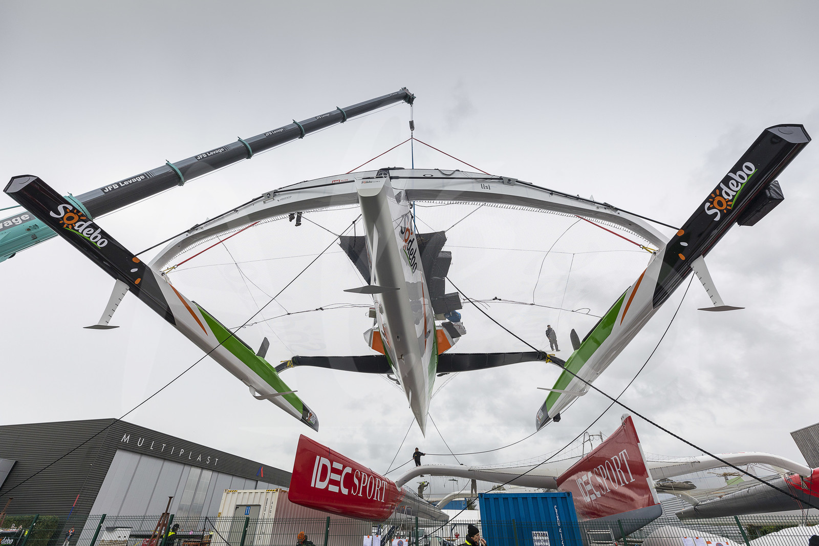 | Description | Launching new Sodebo Ultim 3, skipper Thomas Coville, Multiplast shipyard in Vannes (France), above maxi trimaran IDEC Sport, on March 18th, 2019 - Photo Jean-Marie Liot / Alea |