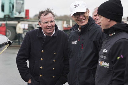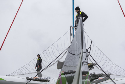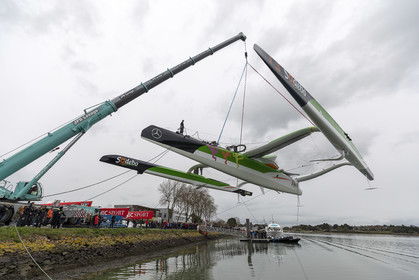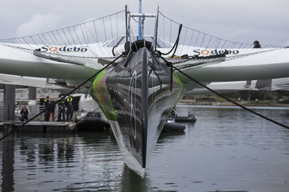 Sélection de photos de la mise à l'eau du nouvel Ultime Sodebo 3, maxi trimaran révolutionnaire avec le mat situé à l'arrière du carré, à Vannes. Il a été construit au chantier Multiplast de Vannes.