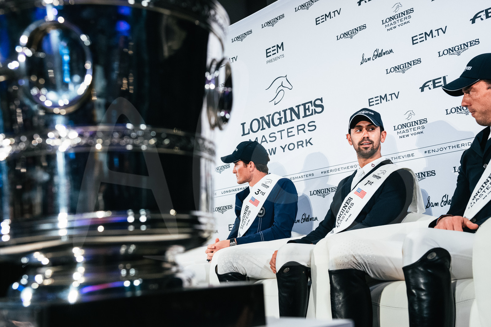 | Description | Press conference with NASSAR Nayel, winner, SMOLDERS Harry, 2nd place, PHILIPPAERTS, Olivier, 3rd place, of the Longines Grand Prix de New York with the trophy in the foreground, during the Longines Masters New York 2019, at NYCB Live, home of the Nassau Veteran's Memorial Coliseum, on April 28th, 2019 - Photo Jean-Louis Carli / Alea / EEM |