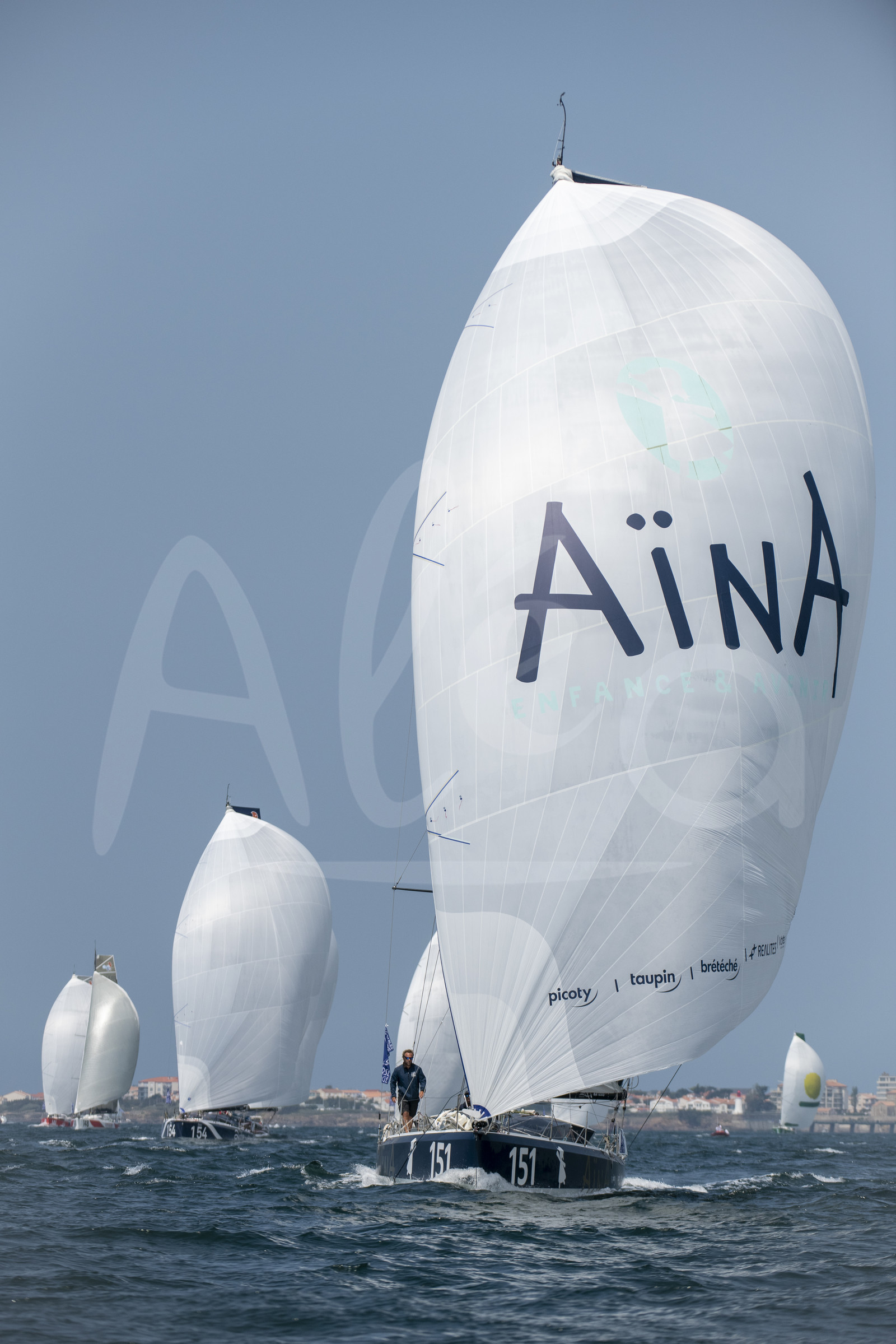| Description | LES SABLES D'OLONNE - JUNE 30, 2019 : French skippers Aymeric Chappellier and Rodrigue Cabbaz, on Aïna Enfance & Avenir, takes the start of the Class 40 sailing race in duo, Les Sables - Horta - Les Sables on June 30, 2019, off Les Sables d'Olonne, France. (Photo by Olivier Blanchet/Alea) |