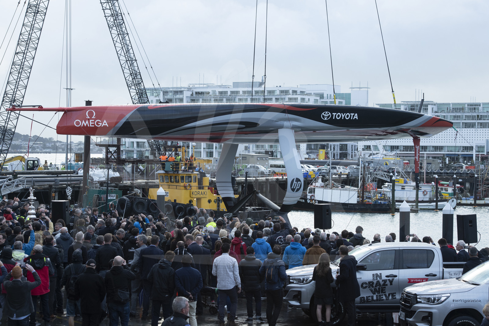 | Description | AUCKLAND, NEW ZEALAND - SEPTEMBER 06: New ETNZ boat named Te Aihe, is lifted onto water during her christening, on September 06, 2019 in Auckland, New Zealand. It was the first AC75 launched by any of the five teams that will be involved in the 2021 Americas Cup in Auckland. (Photo by Chris Cameron/Alea) |
