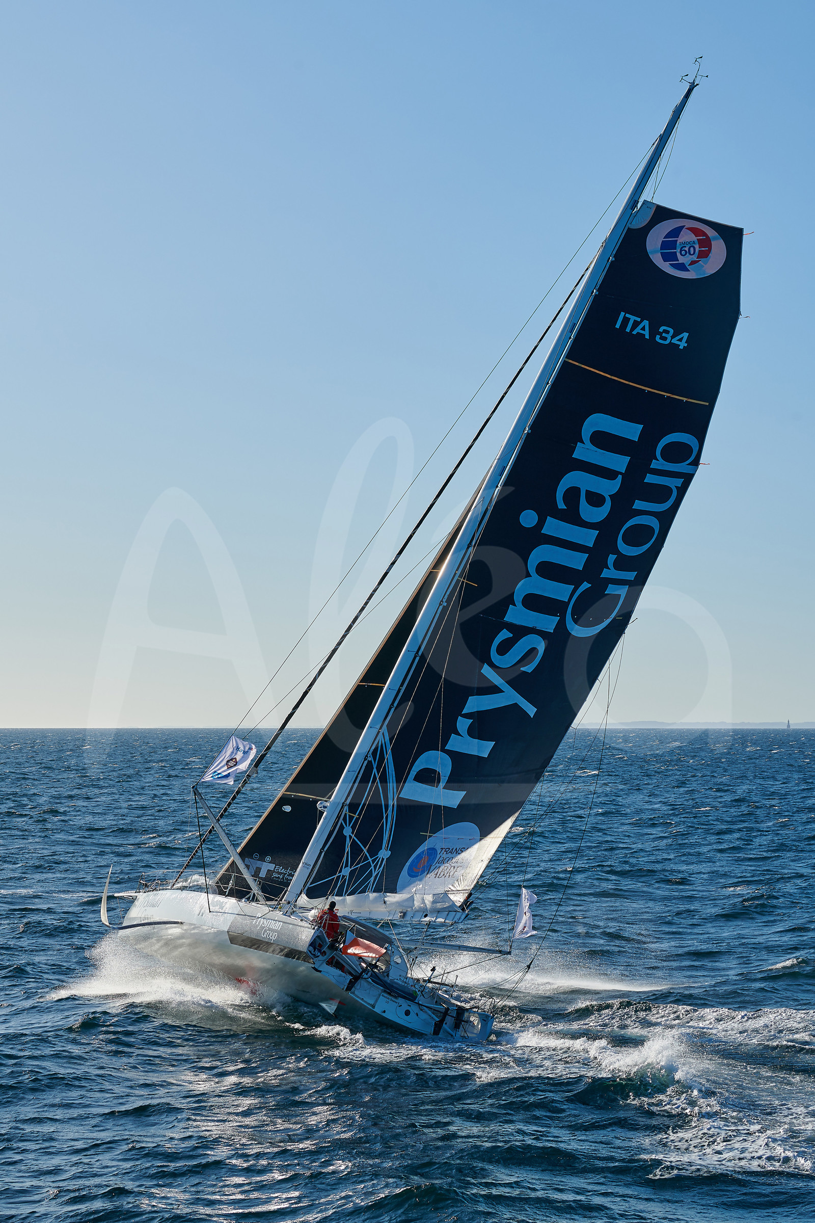 | Description | OFF LORIENT, FRANCE - SEPTEMBER 19: Italian skipper Giancarlo Pedote and French Anthony Marchand are training on the Imoca Prysmian Group, prior to the Transat Jacques Vabre, sailing race in duo from Le Havre to Bahia, on September 19, 2019, off Lorient, France. (Photo by Yvan Zedda/Alea) |