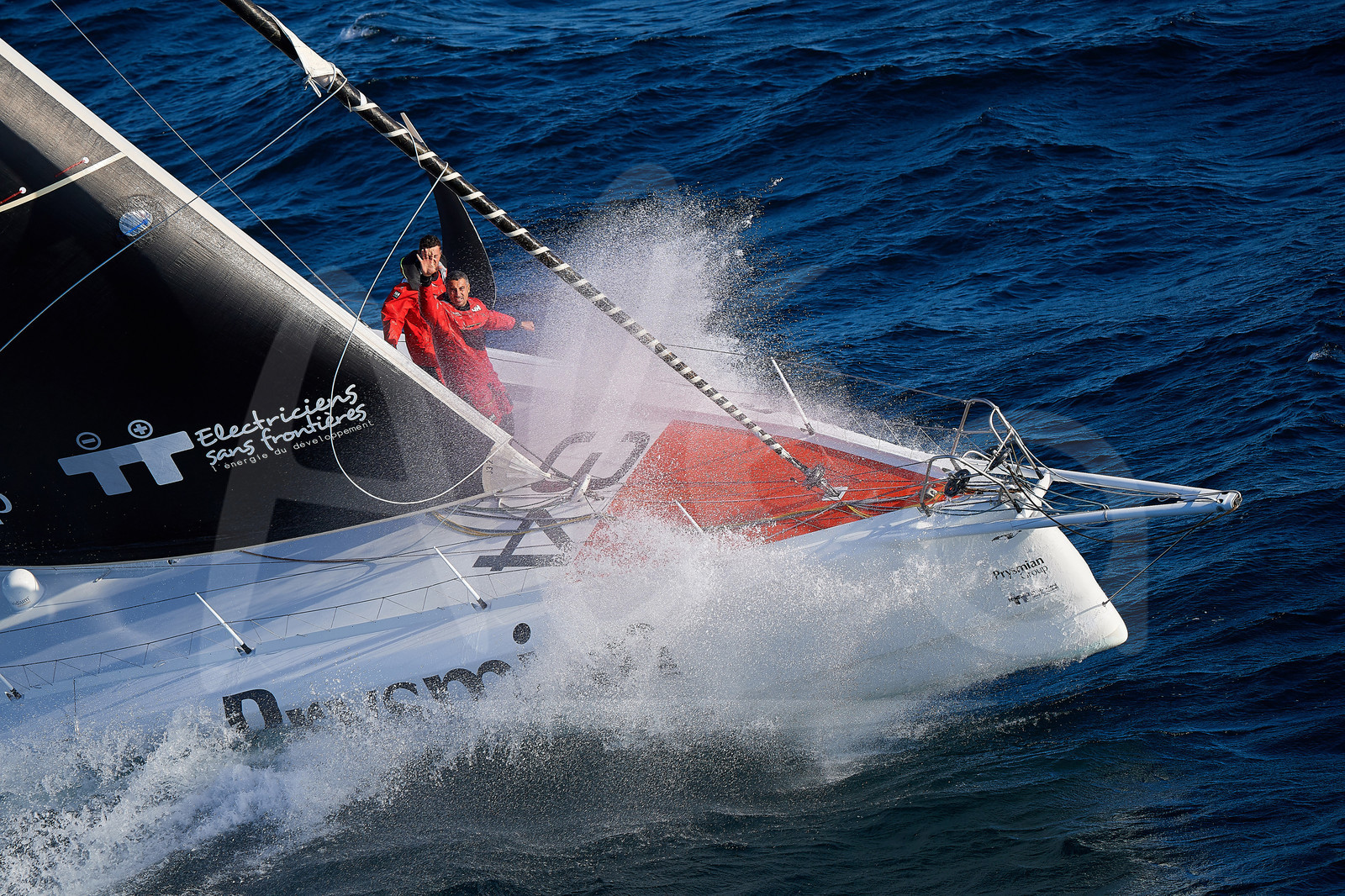 | Description | OFF LORIENT, FRANCE - SEPTEMBER 19: Italian skipper Giancarlo Pedote and French Anthony Marchand are training on the Imoca Prysmian Group, prior to the Transat Jacques Vabre, sailing race in duo from Le Havre to Bahia, on September 19, 2019, off Lorient, France. (Photo by Yvan Zedda/Alea) |
