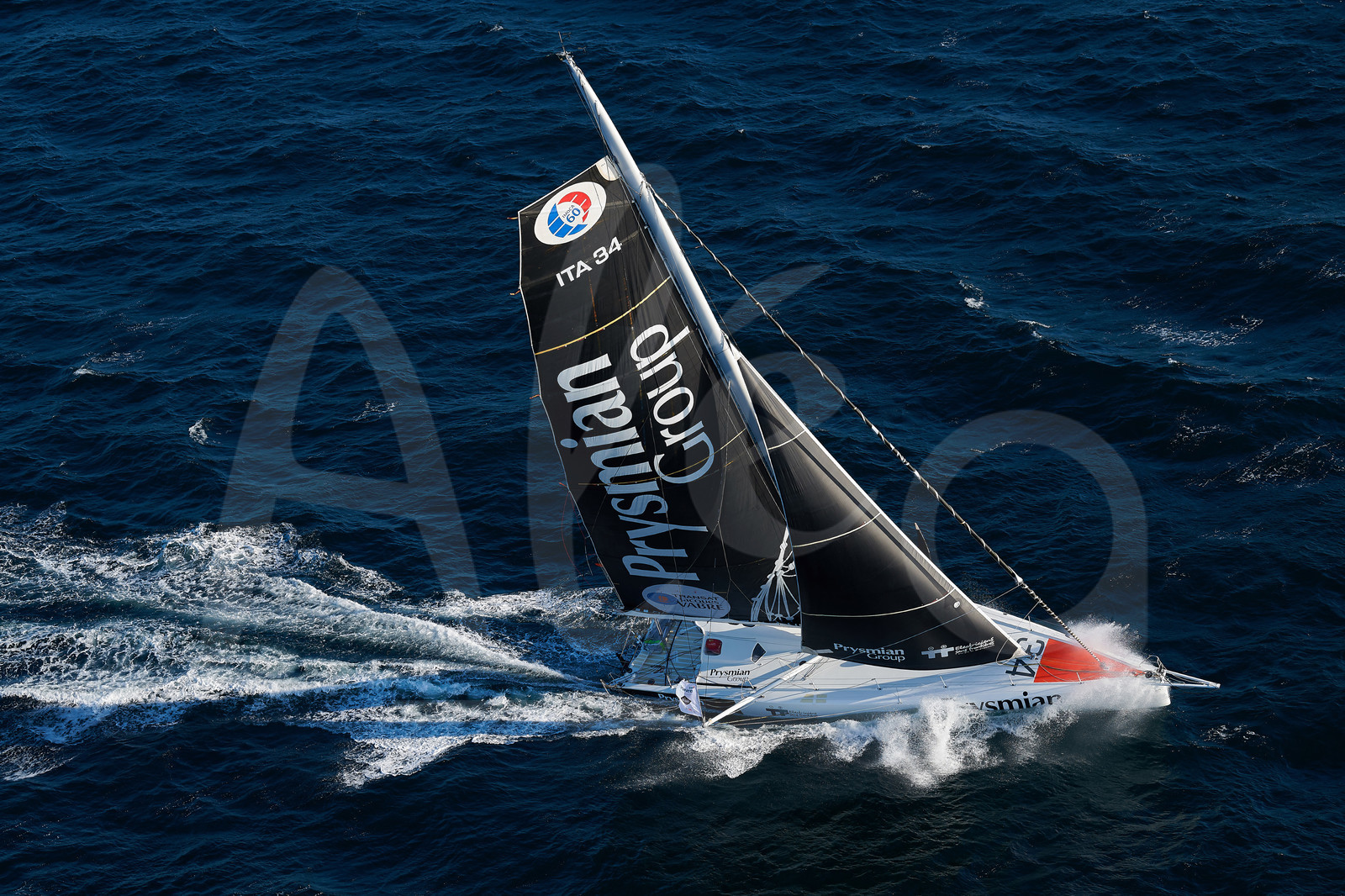 | Description | OFF LORIENT, FRANCE - SEPTEMBER 19: Italian skipper Giancarlo Pedote and French Anthony Marchand are training on the Imoca Prysmian Group, prior to the Transat Jacques Vabre, sailing race in duo from Le Havre to Bahia, on September 19, 2019, off Lorient, France. (Photo by Yvan Zedda/Alea) |
