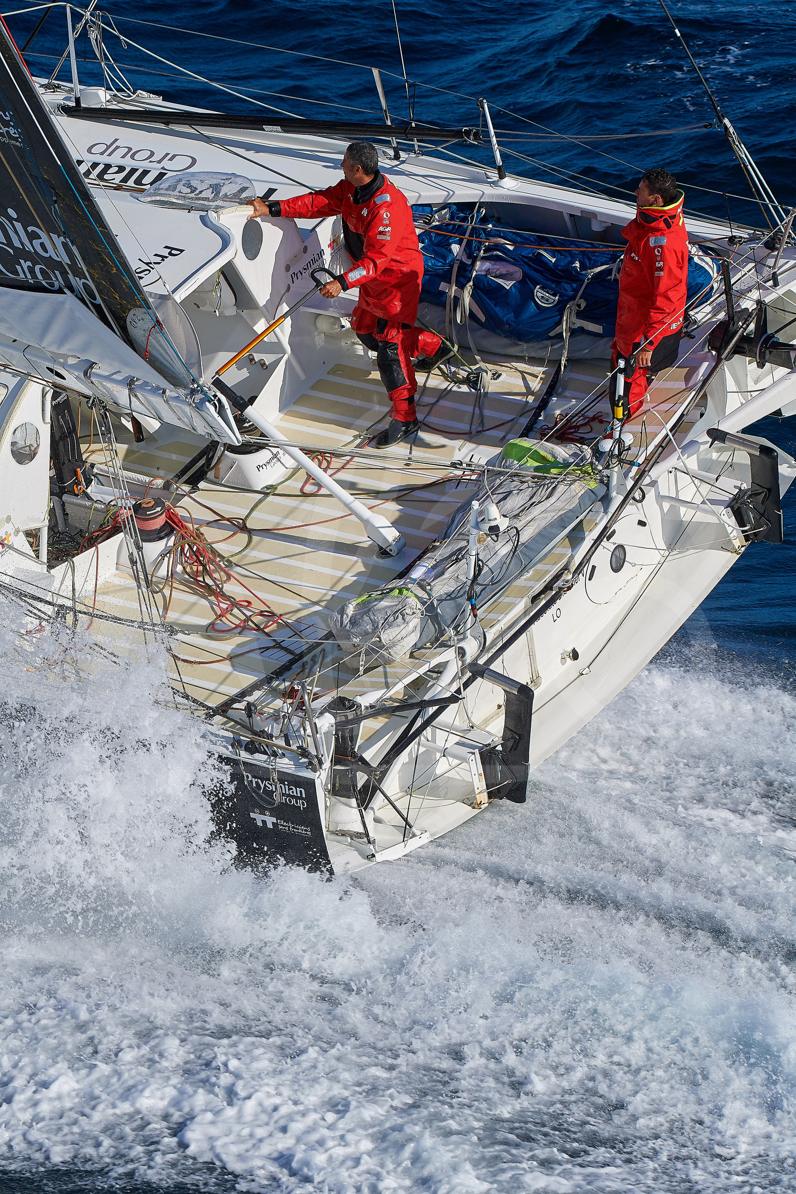 | Description | OFF LORIENT, FRANCE - SEPTEMBER 19: Italian skipper Giancarlo Pedote and French Anthony Marchand are training on the Imoca Prysmian Group, prior to the Transat Jacques Vabre, sailing race in duo from Le Havre to Bahia, on September 19, 2019, off Lorient, France. (Photo by Yvan Zedda/Alea) |