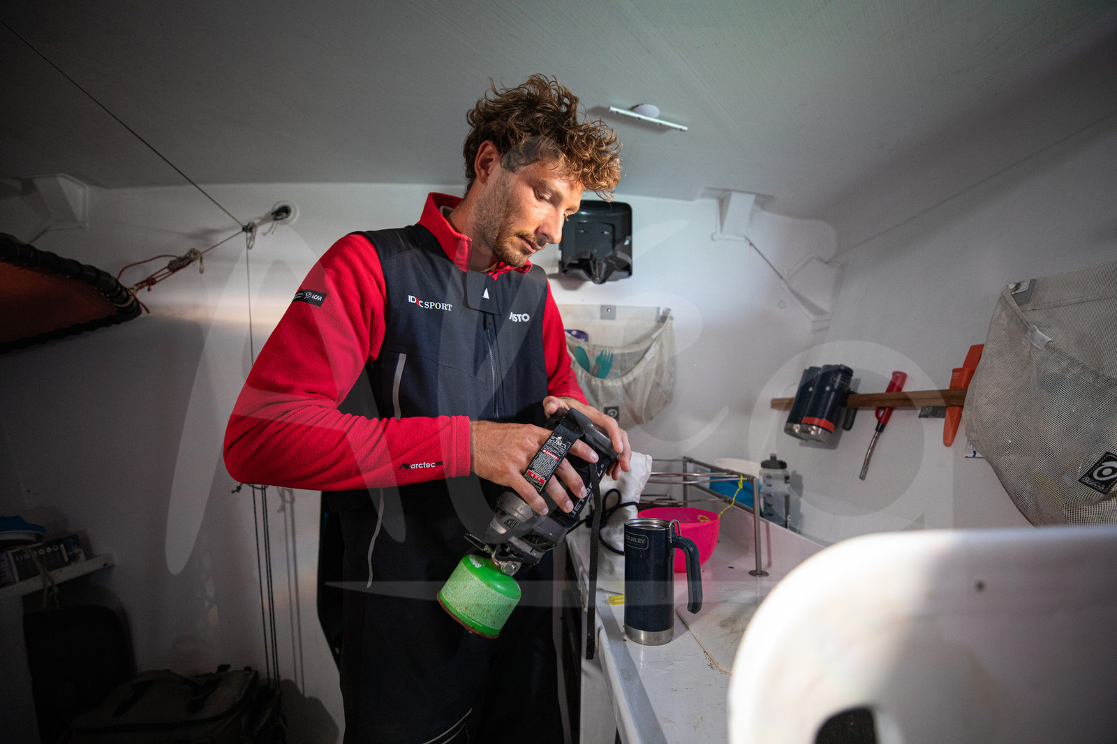 | Description | OFF BELLE-ILE EN MER, FRANCE - SEPTEMBER 18: French skipper Francis Joyon is training onboard the Maxi Trimaran IDEC Sport with his crew, prior to their Asian Tour next winter on September 18, 2019, off Belle-Ile en Mer, France. Here crew member Corentin Joyon making coffe. (Photo by Jean-Marie Liot/Alea) |