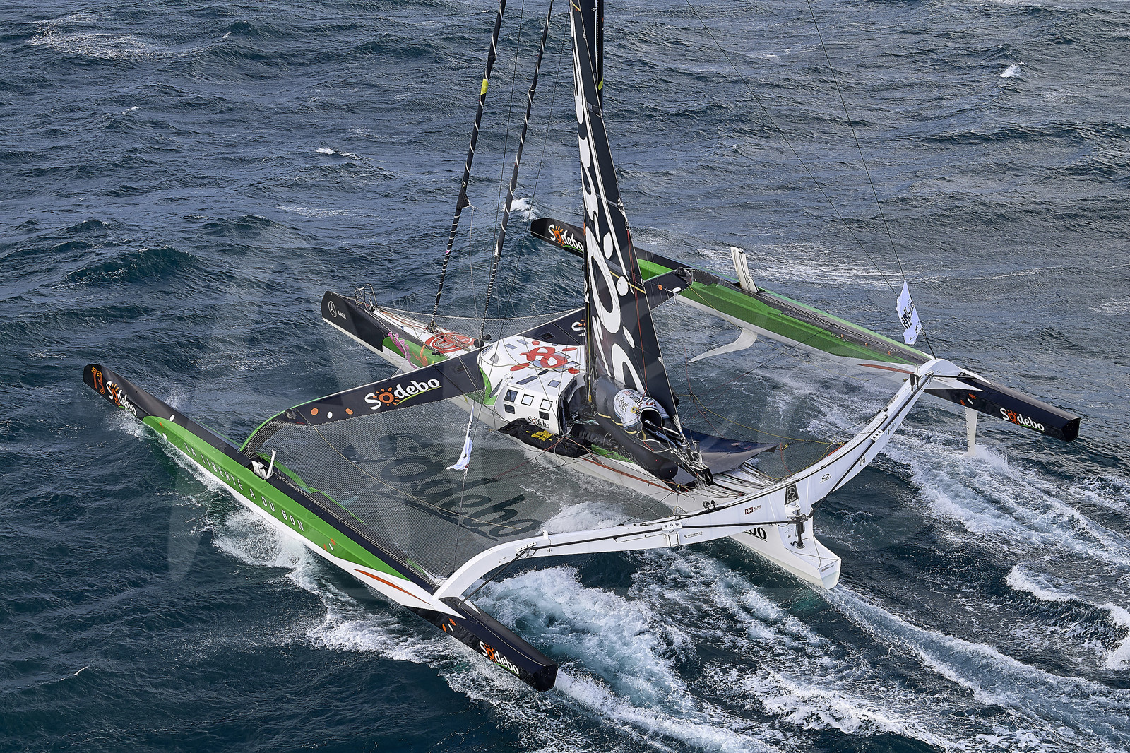 | Description | BREST, FRANCE - NOVEMBER 05: Sodebo Ultim 3 is taking the start of the Brest Atlantiques duo sailing race on November 5, 2019 in Brest, France. Brest Atlantiques is reserved to Class Ultim 32/23, from Brest to Brest, via waypoints off Rio de Janeiro and Cape Town, without any stop. (Photo by Yvan Zedda/Alea) |