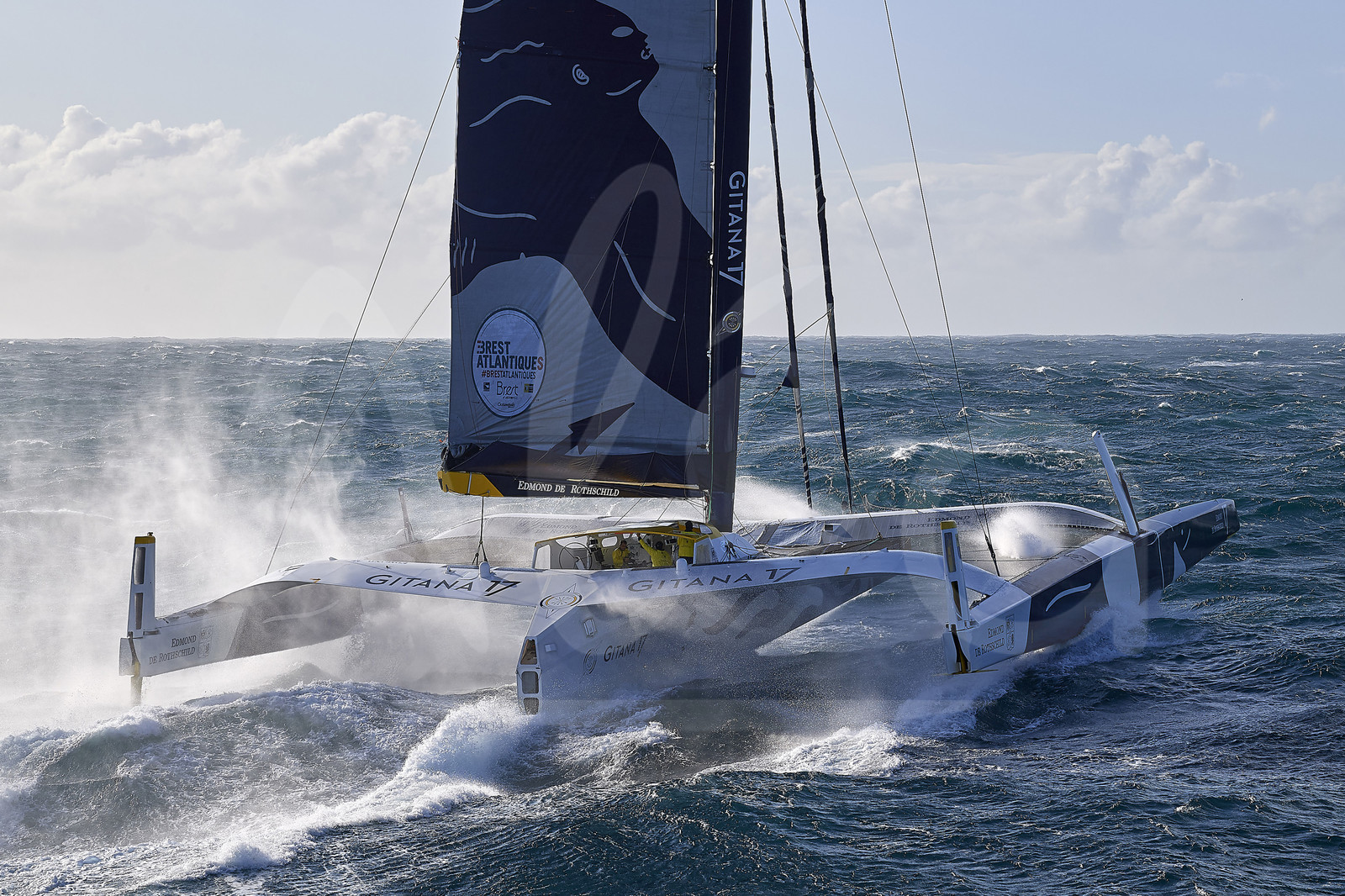 | Description | BREST, FRANCE - NOVEMBER 05: Maxi Edmond de Rothschild skippers Franck Cammas and Charles Caudrelier, and mediaman Yann Riou are busy while taking the start of the Brest Atlantiques duo sailing race on November 5, 2019 in Brest, France. Brest Atlantiques is reserved to Class Ultim 32/23, from Brest to Brest, via waypoints off Rio de Janeiro and Cape Town, without any stop. (Photo by Yvan Zedda/Alea) |
