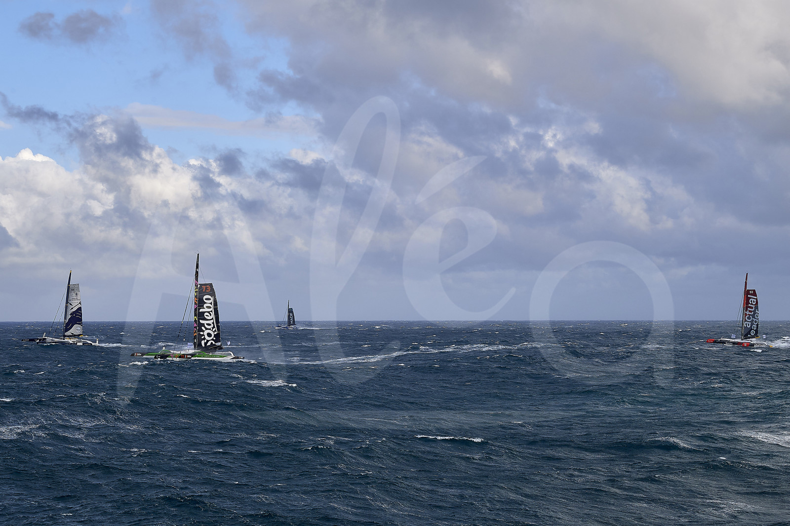 | Description | BREST, FRANCE - NOVEMBER 05: The four Ultims Sodebo Ultim 3, Actual Leader, Maxi Edmond de Rothschild and Trimaran MACIF are taking the start of the Brest Atlantiques duo sailing race on November 5, 2019 in Brest, France. Brest Atlantiques is reserved to Class Ultim 32/23, from Brest to Brest, via waypoints off Rio de Janeiro and Cape Town, without any stop. (Photo by Yvan Zedda/Alea) |
