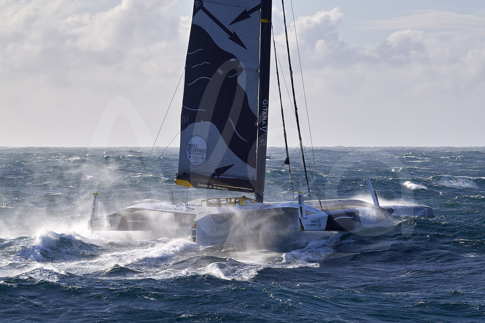 | Description | BREST, FRANCE - NOVEMBER 05: Maxi Edmond de Rothschild is taking the start of the Brest Atlantiques duo sailing race on November 5, 2019 in Brest, France. Brest Atlantiques is reserved to Class Ultim 32/23, from Brest to Brest, via waypoints off Rio de Janeiro and Cape Town, without any stop. (Photo by Yvan Zedda/Alea) |