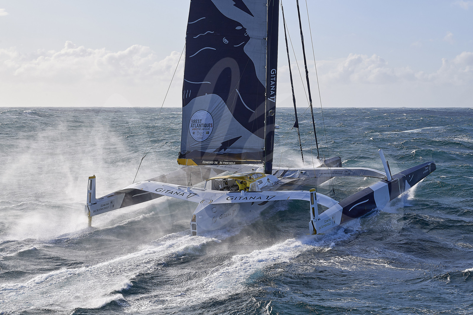 | Description | BREST, FRANCE - NOVEMBER 05: Maxi Edmond de Rothschild skippers Franck Cammas and Charles Caudrelier, and mediaman Yann Riou are busy while taking the start of the Brest Atlantiques duo sailing race on November 5, 2019 in Brest, France. Brest Atlantiques is reserved to Class Ultim 32/23, from Brest to Brest, via waypoints off Rio de Janeiro and Cape Town, without any stop. (Photo by Yvan Zedda/Alea) |